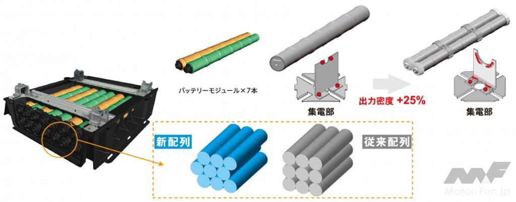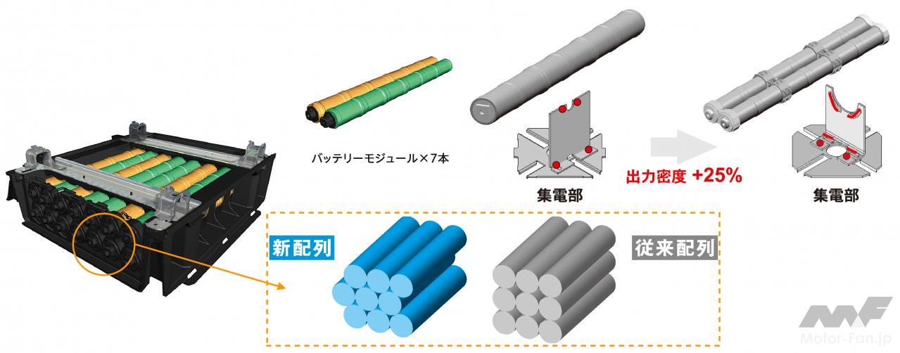 1.2Vの単セルを12本まとめたのが1モジュール(14.4V)。シビック・ハイブリッドは11モジュールなので158V。インサイトは7モジュールなので100.8Vとなる。三洋電機の努力の甲斐があり、内部抵抗を3割下げることで出力を3割高めることに成功。と同時に耐久性を3割高める努力もしている。電気のやりとりを従来よりも激しく行なえば、電極の傷みもそのぶん早く進行する。出力は高いが寿命は短いでは製品として成立しないため、耐久性向上も外せない課題だった。※図版は2代目シビック・ハイブリッドのもの。