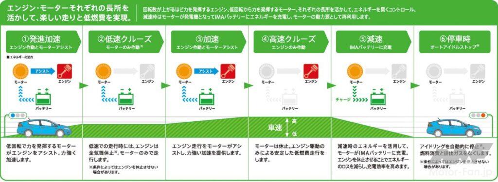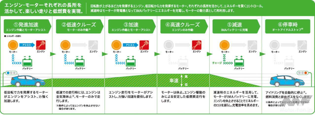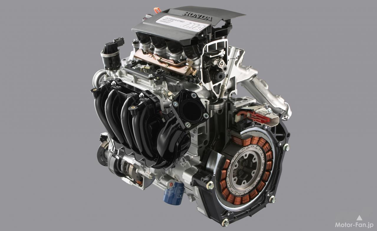 i-VTECエンジン(気筒休止付き):減速時の回生効率をいかに向上させるかが、ハイブリッド車の生命線。ホンダは得意のVTEC技術を使って全気筒休止を実現。エンジンのフリクションを減らし、全減速エネルギーの3分の2を回生する。クラッチでモーターからエンジンを切り離すことによって得られる分はほとんどないとホンダは主張。クラッチを作動させる制御や機構にウエイトやコストを費やすよりスマートな技術だと自負している。