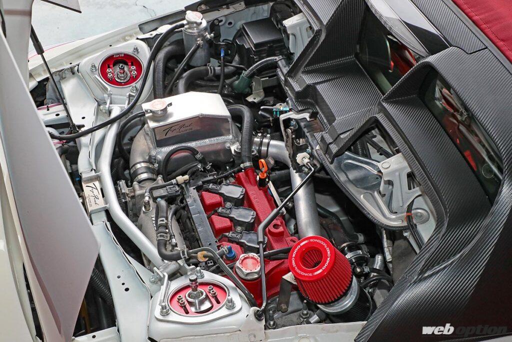 なお、走りとともにアップデートを重ねているのが、スタイリングのオリジナリティ。放熱性を高めるために大胆な肉抜き加工を施したリヤバンパーへ合わせ、ガレージベリーのエアロパーツやトップフューエルのエアロボンネットなどで、スパルタンな仕上がりになっている。