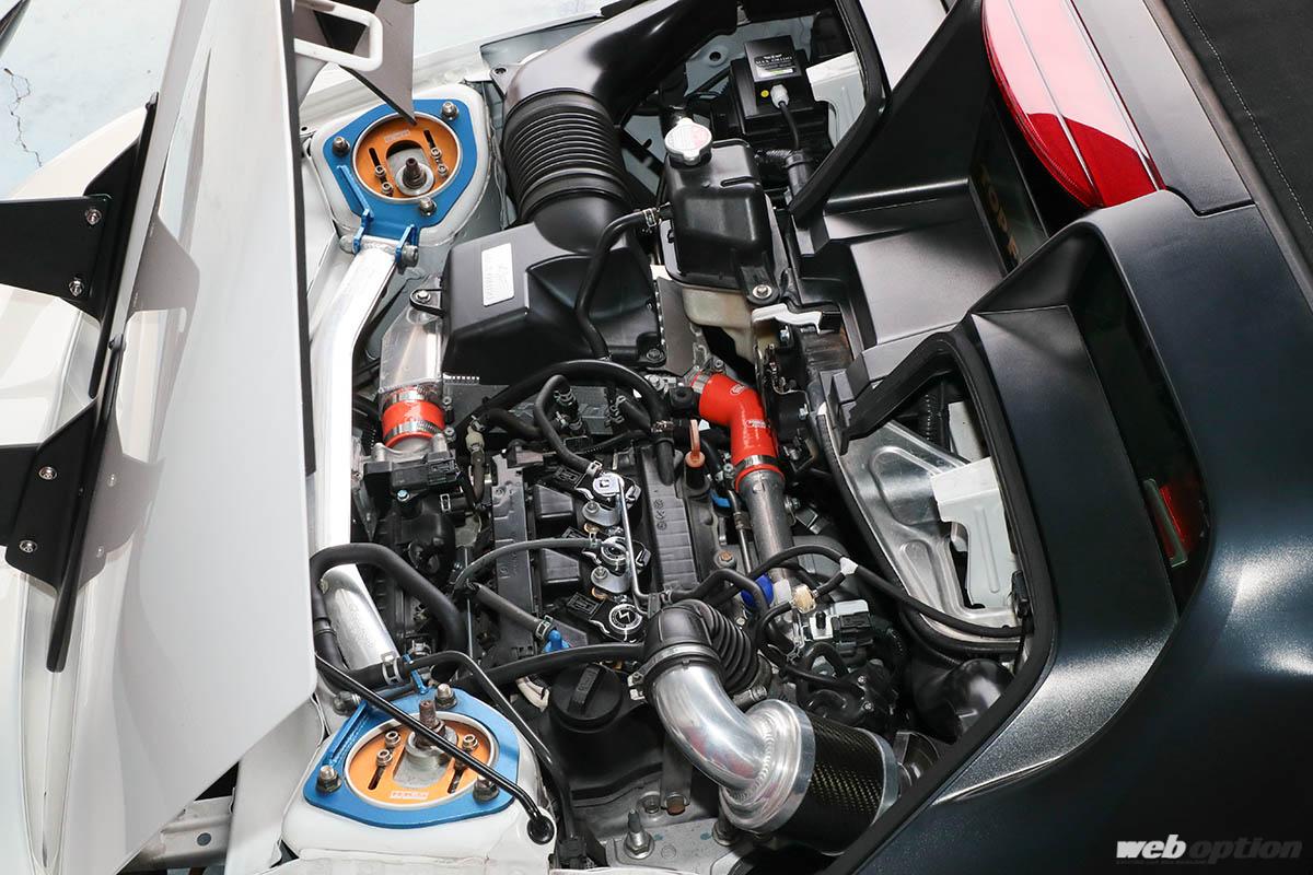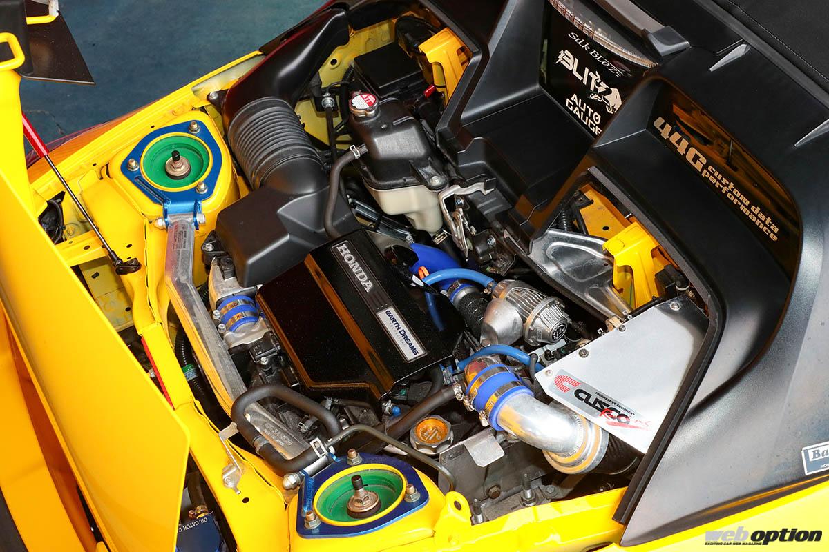 当初は長く乗るためにノーマルを貫くつもりだったが、やはり変化が欲しくなりチューニングを開始。ルックスはS660らしいスピードスタイルを表現すべく、イエローのボディに映えるレッドのアクセントラインをあしらった。注目はエンジンの放熱性にも拘ったアグレッシブなデザインのBYSリヤバンパー。シルクブレイズの大型リヤウイングと相まって、唯一無二といえる迫力を放っている。