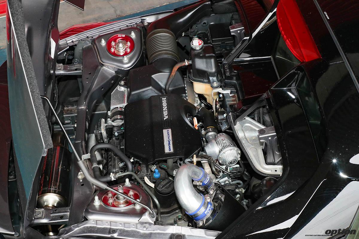 ちなみに、現在のエンジンスペックは筑波1分3秒台を目標にチョイスしたトップフューエル・オリジナルタービン仕様で、最高出力は215ps。5000〜9000romという高い回転域で本領を発揮するドッカン特性は快感の一言で、ワイドボディの迫力に負けない速さに大満足とのこと。