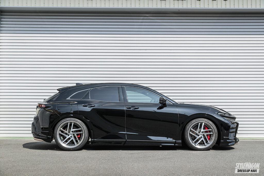 そのマッチングはご覧の通りのカッコよさ! 22インチの大径感とハイクオリティなデザインの相乗効果で、クラウンスポーツの高級感をワンランク上のレベルへと高めている。このサイズとなるとブレーキのクリアランスにも余裕が生まれ見た目のバランスも良好。ただタイヤ外径との兼ねあいがあるため、クラウンスポーツには基本22インチが最大級のマッチアップ。