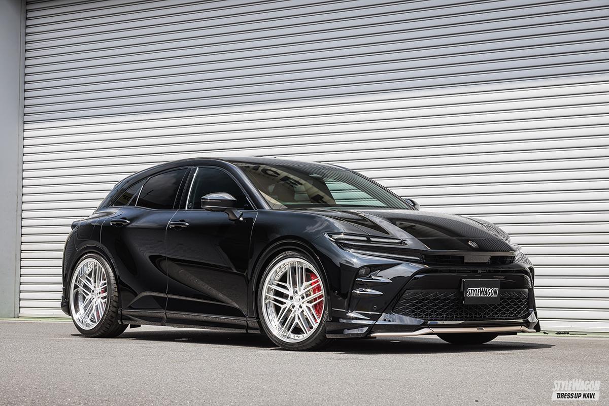 クラウンクロスオーバーからスポーツにデモカーを変更。カッコいいスタイルを目指して日夜研究を重ねる『タイヤショップ エクスチェンジ』。ギリギリのツライチを狙うにはローダウンやアライメント調整が必須となるしサイズ選びも肝心。ユーザー目線でのカスタマイズを提案してくれるエクスチェンジなら安心して相談できる。