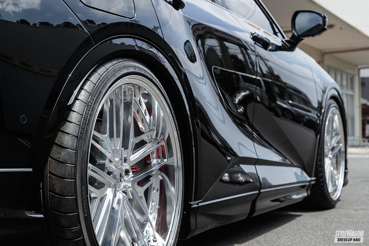 そのマッチングはご覧の通りのカッコよさ! 22インチの大径感とハイクオリティなデザインの相乗効果で、クラウンスポーツの高級感をワンランク上のレベルへと高めている。このサイズとなるとブレーキのクリアランスにも余裕が生まれ見た目のバランスも良好。ただタイヤ外径との兼ねあいがあるため、クラウンスポーツには基本22インチが最大級のマッチアップ。