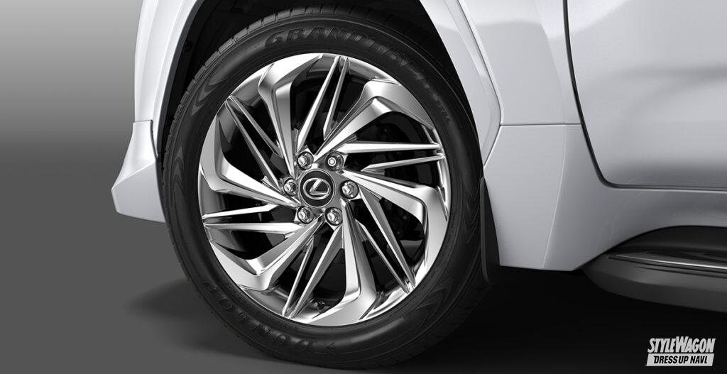スポイラーとは別体で設計されたメッキパーツを効果的に採用し、都会的な雰囲気を大きく底上げしてくれるのが、モデリスタのLX用ボディキットだ。フロントマスクではボトム部分に横長のメッキラインを施し、純正のスピンドルデザインを自然に強調。リアにも対応するようにメッキラインを入れる。さらに注目がサイドステップメタルプレートだ。ステンレス製のプレートを使うことで、素材の違いが生み出す質感にも変化を与えている。また、オリジナルホイール(22インチ)はモノブロックの鍛造というから驚き。足下からLXの雰囲気を下支えしてくれるはず。