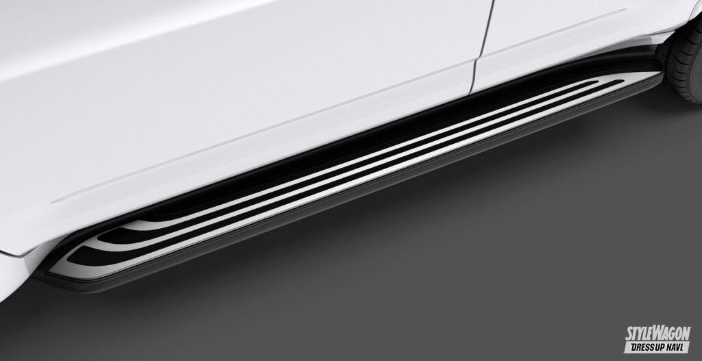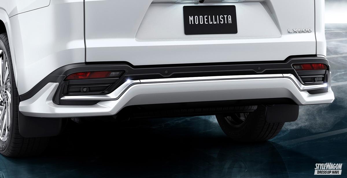 スポイラーとは別体で設計されたメッキパーツを効果的に採用し、都会的な雰囲気を大きく底上げしてくれるのが、モデリスタのLX用ボディキットだ。フロントマスクではボトム部分に横長のメッキラインを施し、純正のスピンドルデザインを自然に強調。リアにも対応するようにメッキラインを入れる。さらに注目がサイドステップメタルプレートだ。ステンレス製のプレートを使うことで、素材の違いが生み出す質感にも変化を与えている。また、オリジナルホイール(22インチ)はモノブロックの鍛造というから驚き。足下からLXの雰囲気を下支えしてくれるはず。