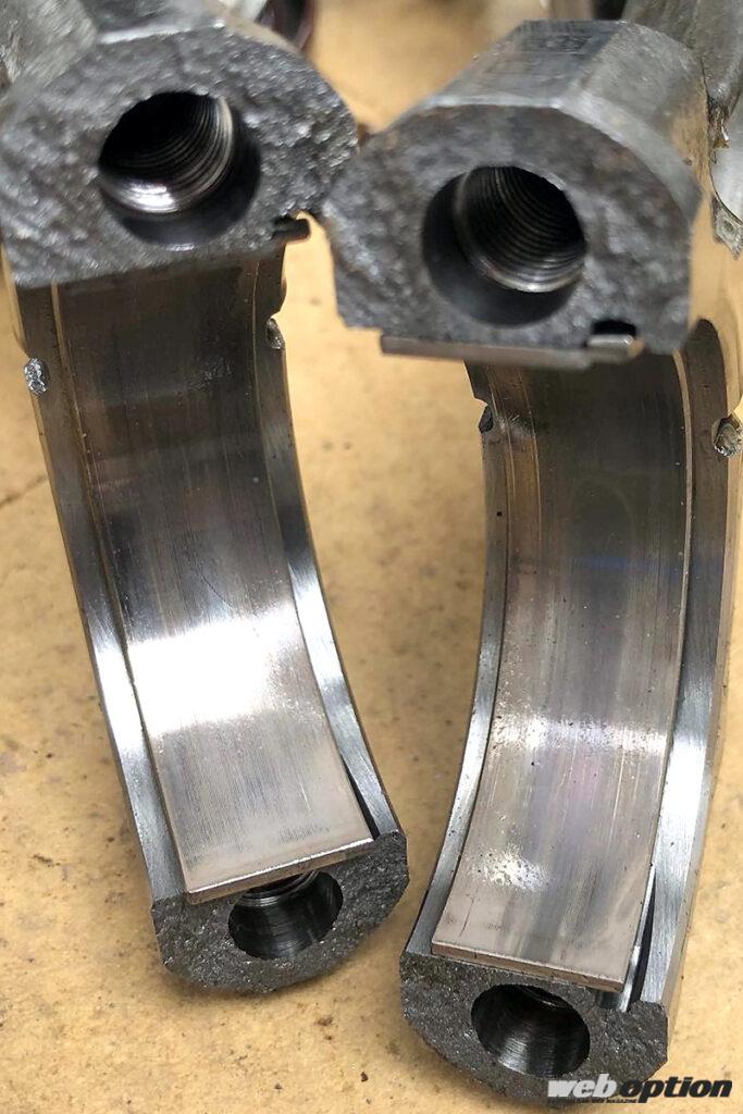 「経験上、NA用純正コンロッドは300psを超えると曲がり始める。たとえ折れなくても、曲がったらメタルが偏当たりするし、その先はいくらも保たないでブローするのが確実。これがターボ用になると、肉厚が微妙に増していたり部分的にリブ補強が加えられたりして、強度や耐久性が格段に向上してる。400psは楽に許容するから、ボルトオン過給機仕様では強化品として使えるんだ」。