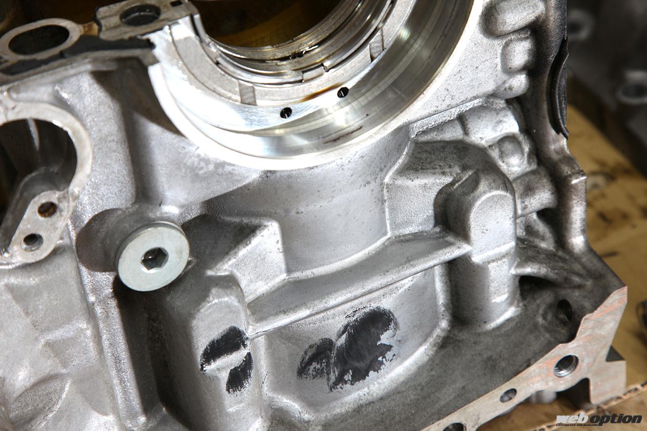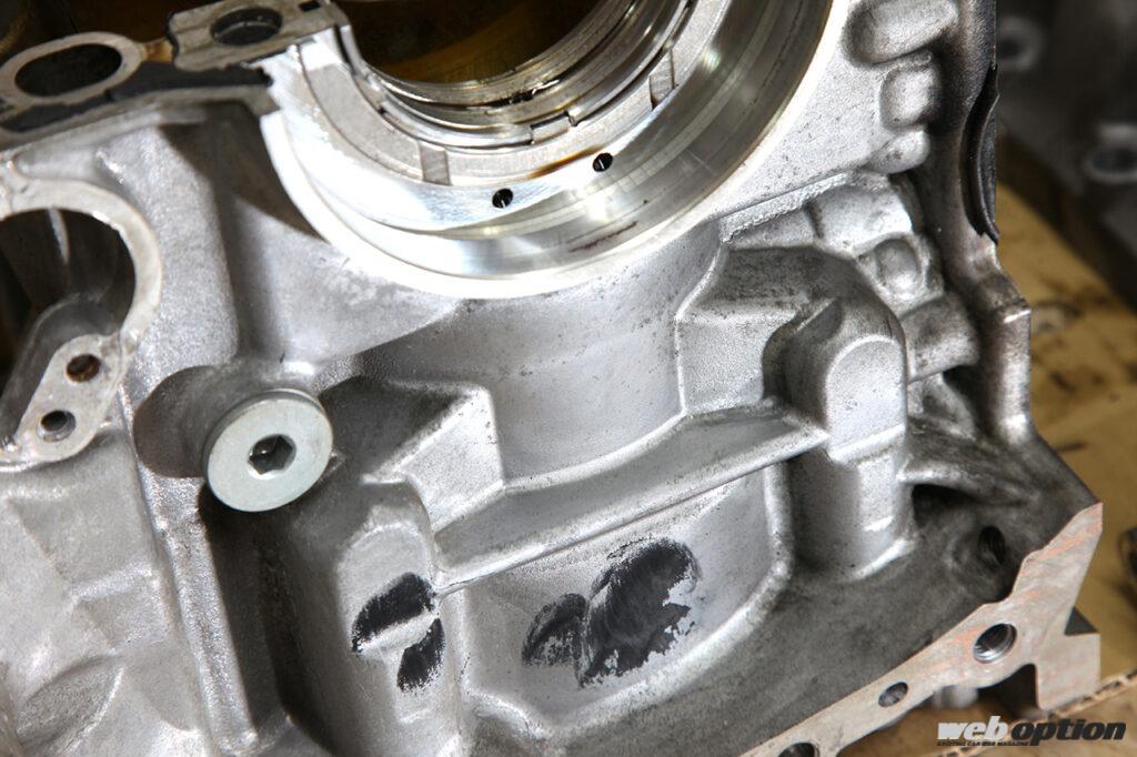 「まず大きく変わったのは、左右シリンダーブロックの合わせ面にノックピンが追加されたこと。これはポルシェの水平対向エンジンでも昔から採用されていて、パワーを上げていってもシリンダーブロックが変形しにくく、クランクメタルのトラブルからも解放される。同じ2.0L同士で比べると、ブロック剛性はFAの方が確実に高いよ。ちなみに、ウチではEJで600ps以上を狙う時に同じようなノックピン加工をしてるけど、FAには初めから付いてるってわけ。あとはオープンデッキ構造だけど、肉厚を稼いで十分なブロック強度を確保したり、リブ追加によってクランクキャップ剛性を高めたりもしてるよね。ブロック単体で見ると500psくらいなら普通に対応できると思う」。