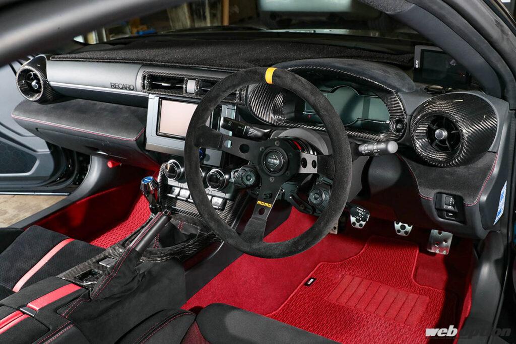 かつてはキャンディレッドにオールペンしたシルビアなど、ド派手なチューンドを愛車としていた勝部さんだが、GR86は渋めの仕上げとするべくオールブラックで統一。内装パーツもカーボンやウルトラスウェードで統一するなどシックな仕様を目指してGR86遊びを全力で楽しんでいる最中だ。
