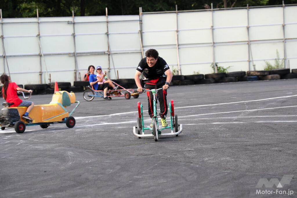 イベントのラストを飾るのは、群馬サイクルスポーツセンターらしく、変わり種自転車によるレース。新井選手、久保選手の参加はもちろん、協賛メーカーの方々と一般参加者がヘンテコ自転車で本気で競い合った。本気で勝ちに行った新井選手の姿には、賞賛と共に大人気ないとの声も(笑)。