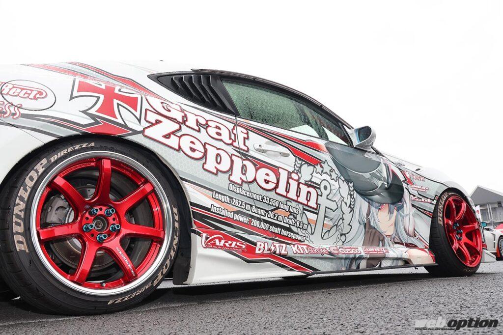 そうしたスタイリングやキャンディレッドの足元に合わせてオーダーしたのは、スマホゲームの『アズールレーン』で人気を誇る“グラーフ・ツェッペリン”をあしらったD1マシン風ラッピング。キャラクター部分はインクジェット出力の一枚貼りだが、メーカーロゴなどの文字部分は曲面で生じるズレを抑制するため重ね張りされた拘りの仕上げだ。