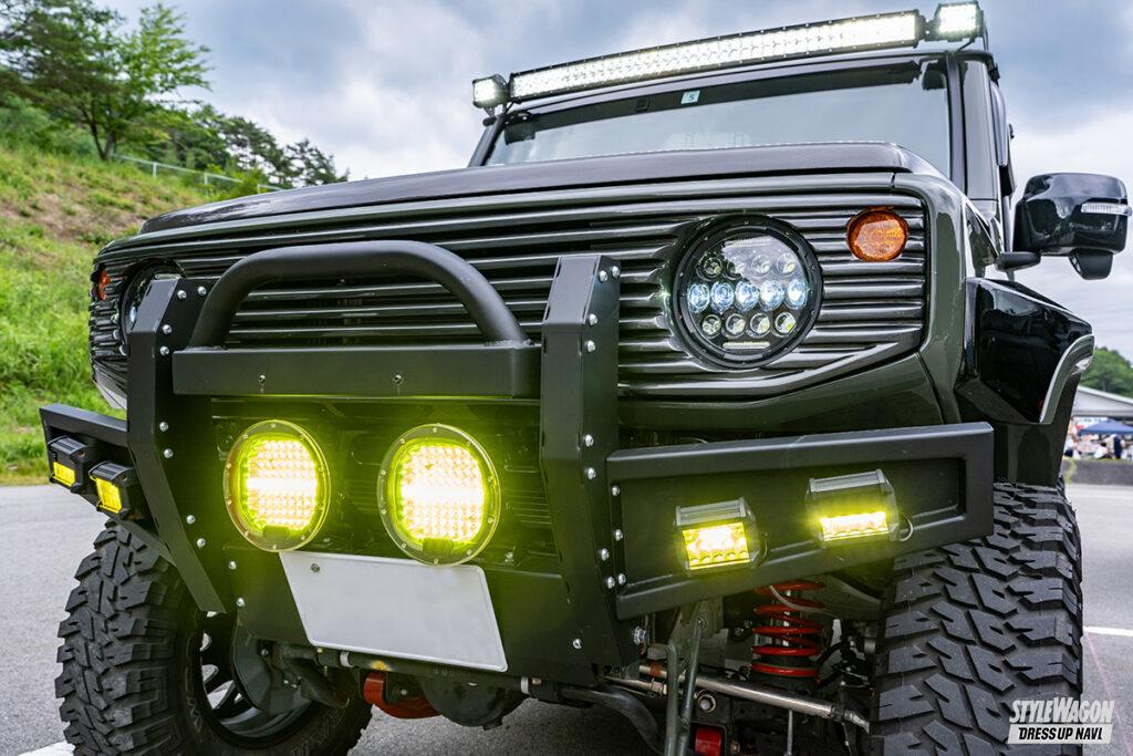 ●外観:ビーストRクラッシュタイプTダンパー、クラッシュフェンダー、サイドガードステップ、グーニーズワンルーフバスケット、カーボンボンネット ●足まわり:ビーストR・Bトラクション ●エンジン:HB-1ジェントルマフラー ●室内:ブリッドバケットシート ●ホイール:モーターファームD10 ●タイヤ:ラングラー(245/75-16)