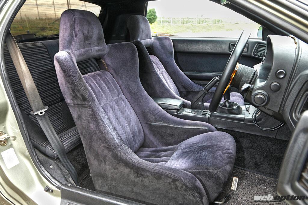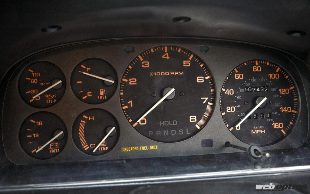 一方のインテリアは一見するとノーマルだが、入手困難なアンフィニグレードのセミバケットシートを装着したり、スピードメーターをUSマイル表示仕様に変更するなど、マニアックなカスタムが施されていたりする。