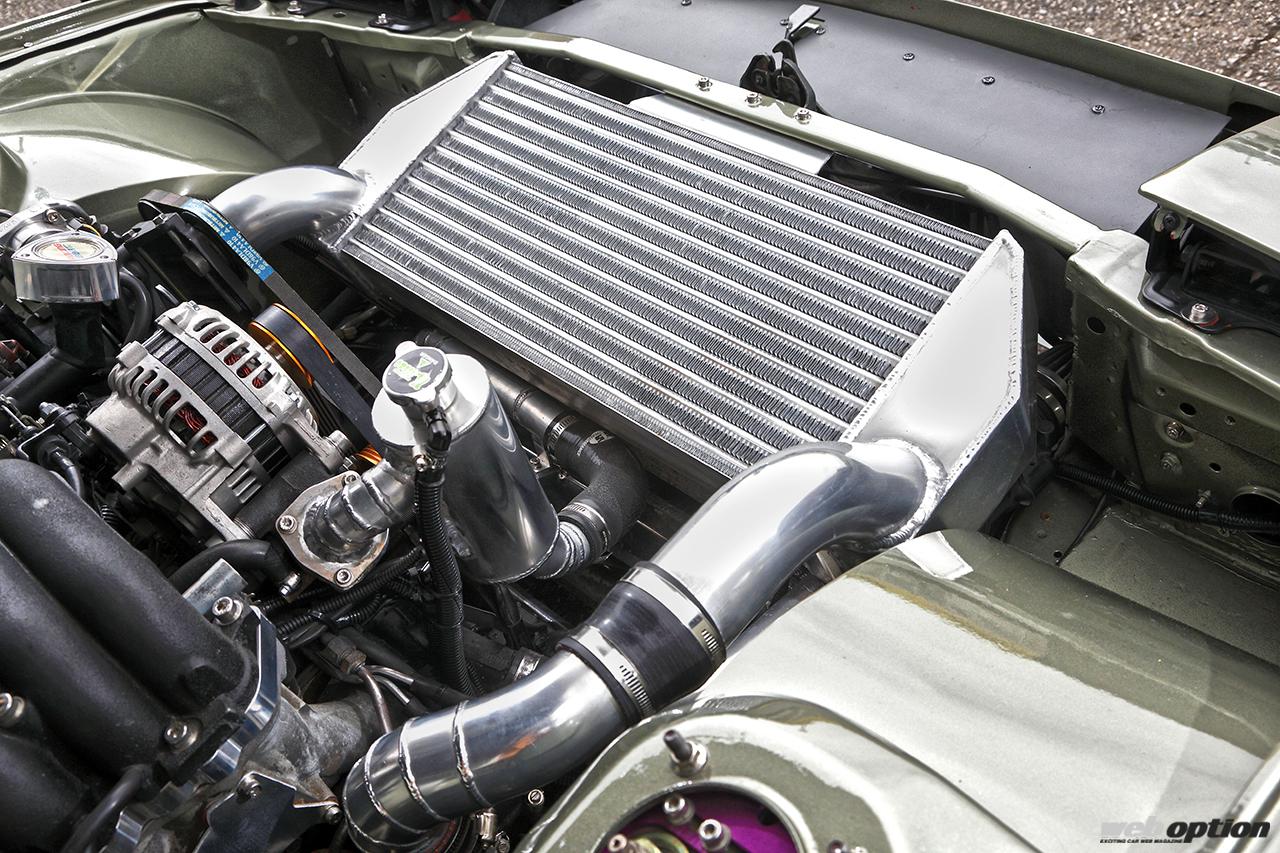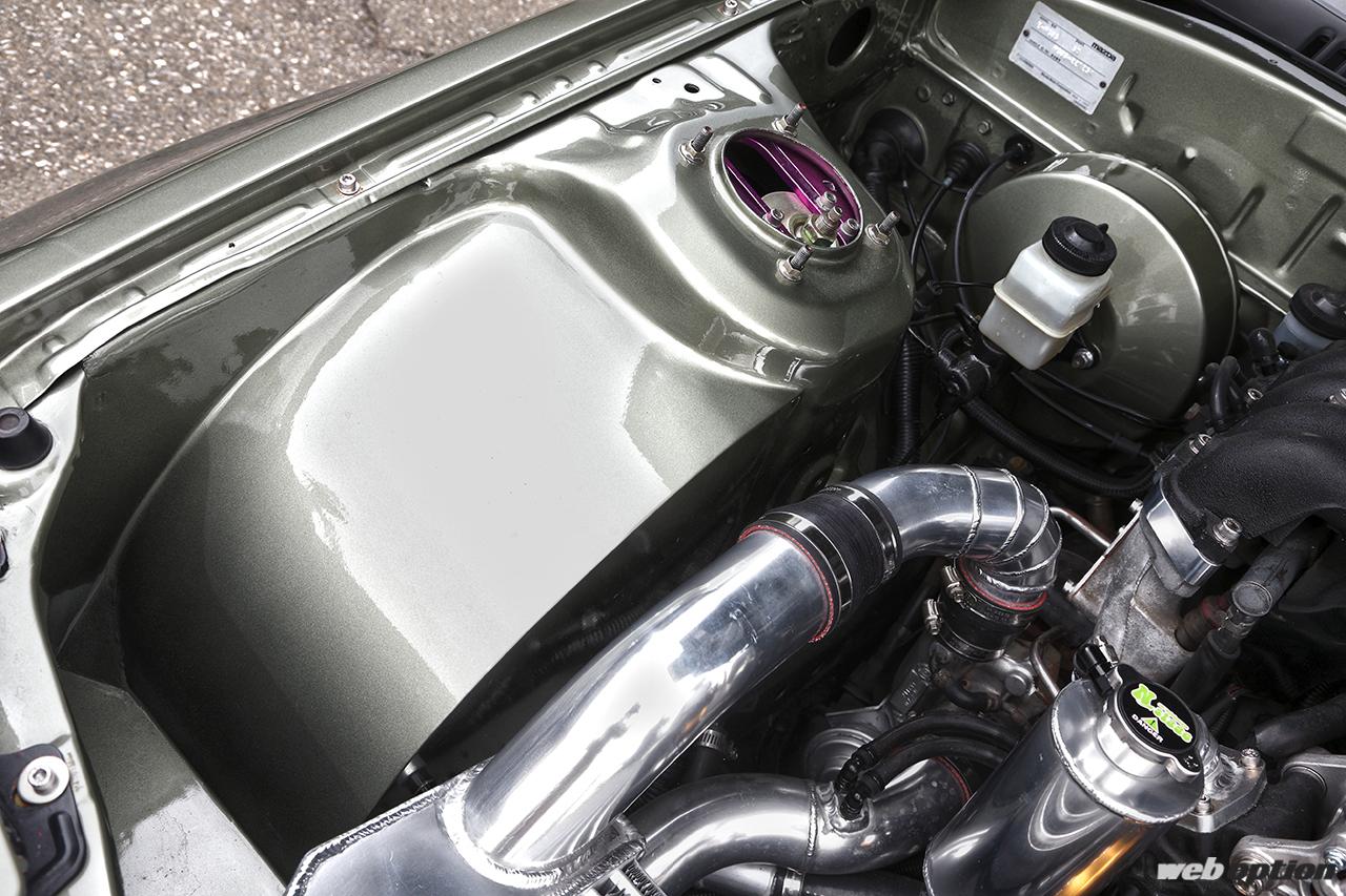 エンジンベイも凄まじいレベル。13B-Tユニット自体はノーマルだが、ワンオフのVマウントシステムやスペシャルメイドのパイピング、ブラックアウトされたFD3Sサージタンクなど、美観を徹底追求。サイクルフェンダーやワイヤータックなど、最新のカスタムトレンドも積極的に導入しているのもポイントと言えよう。