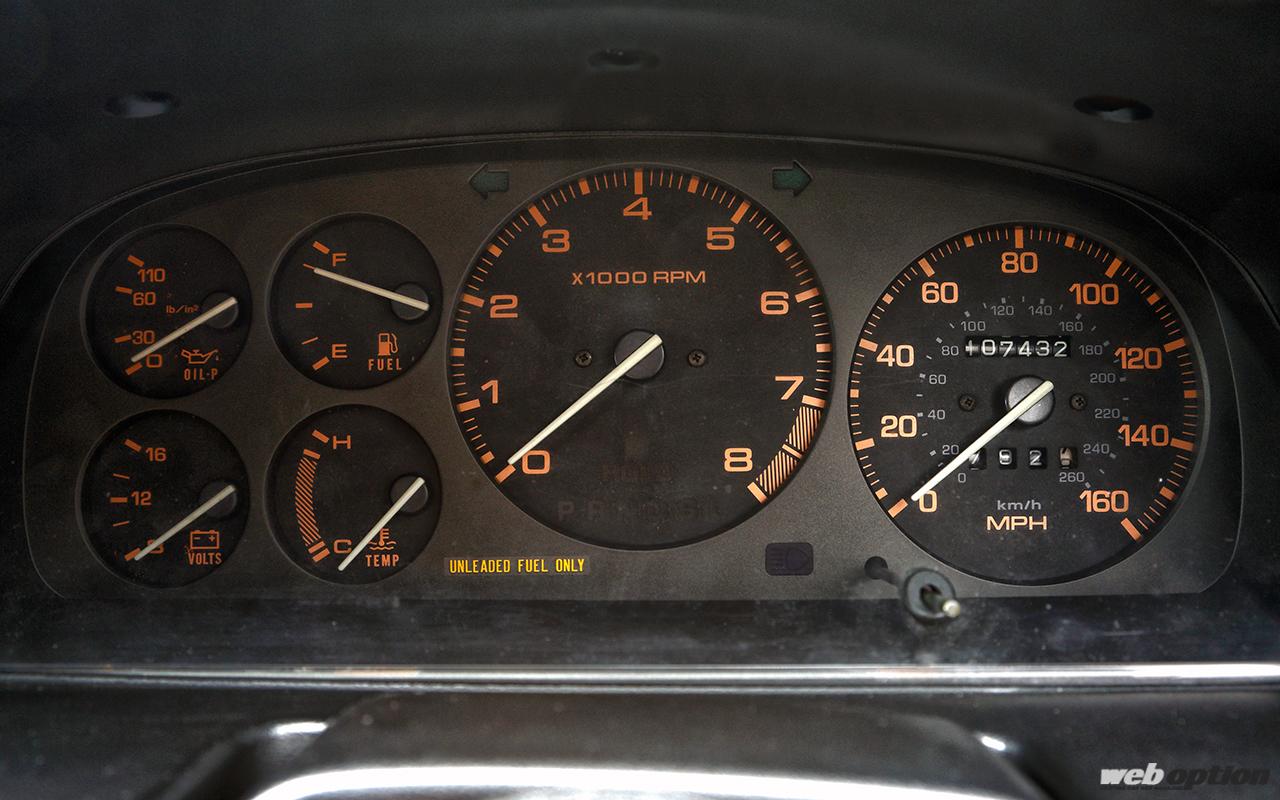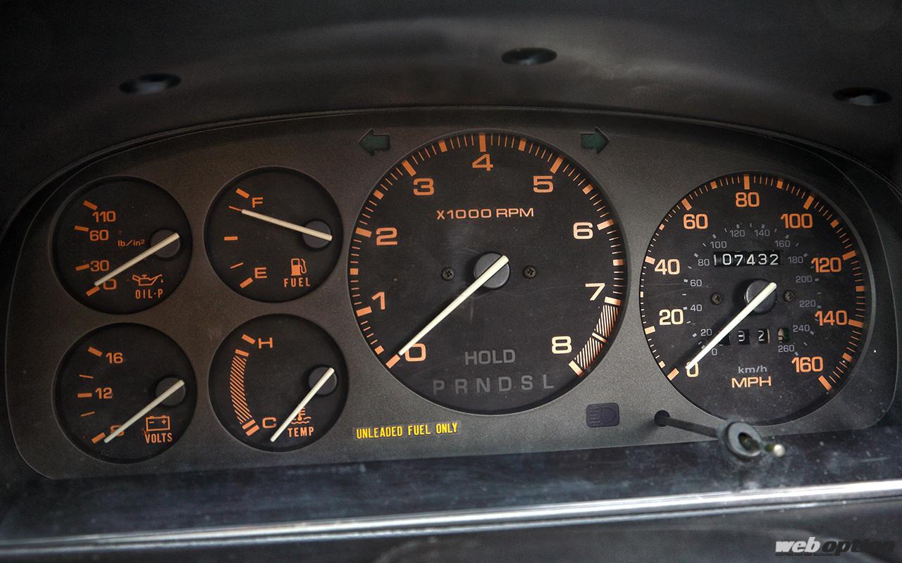 一方のインテリアは一見するとノーマルだが、入手困難なアンフィニグレードのセミバケットシートを装着したり、スピードメーターをUSマイル表示仕様に変更するなど、マニアックなカスタムが施されていたりする。