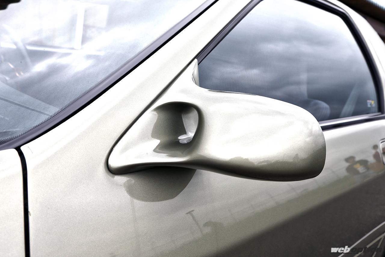 エクステリアは基本的に純正のボディラインを生かす方向で進められているが、灯火類などをUS仕様としているのも大きな拘りだ。フロントバンパーはアニバーサリー製、珍しいタイプのエアロミラーは北米仕様となる。