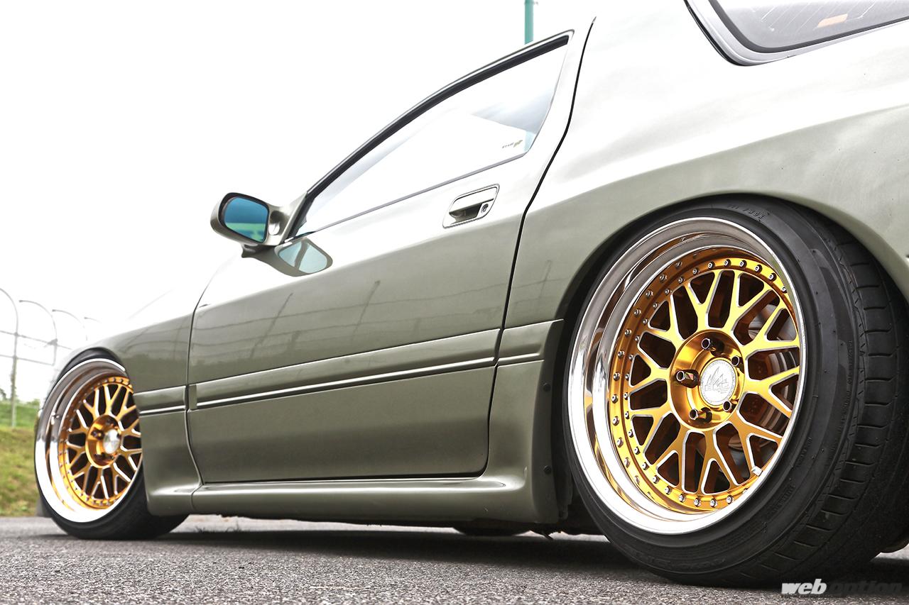 ミレニアムジェイドのボディカラーと絶妙なマッチングを見せるホイールは、アラビアンゴールドのバラマンディToman。車高を落とすために17インチを選択し、フロント9.5J+10、リヤ10J+10というサイズに215幅のタイヤを引っ張ってインストールしている。