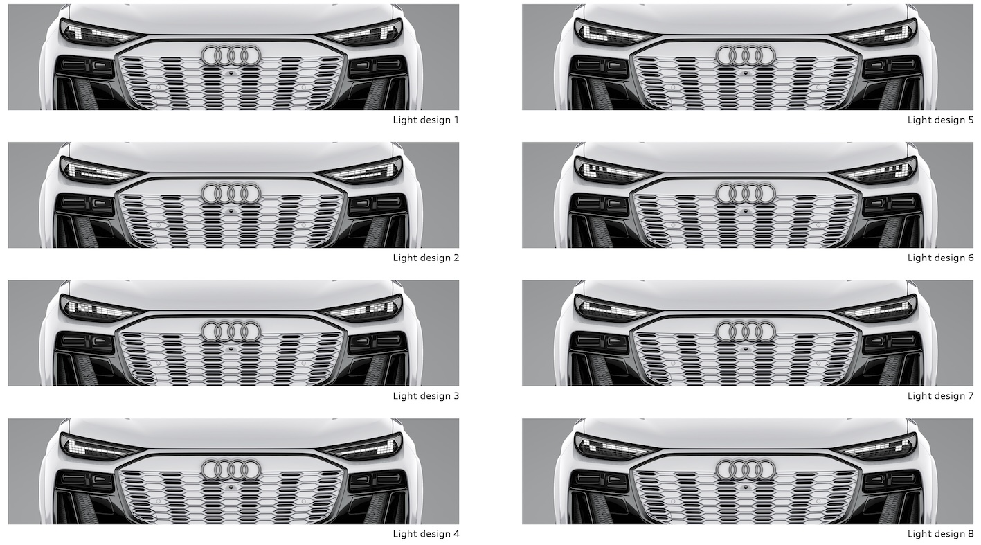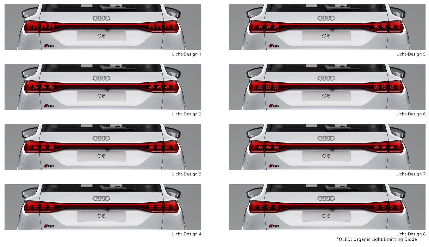 Q6 e-tronのフロント/リヤのライトは、「ユーザーが自分のお気に入りを選べる」デザインになっている。Audi Digital Lightは、それだけでなくクルマの幅を強調する役割もある。「デザインはヘッドラップから始まる」とプレゼンテーションで説明するように、さまざまな光り方でさまざまな機能を司る。
