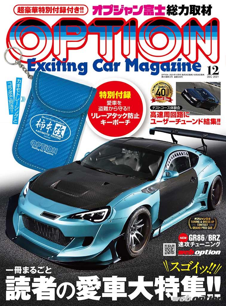 オプション12月号には、特別付録としてカキモトレーシングとOPTIONがタッグを組んで製作したブルーカーボンPUレザーの『リレーアタック防止キーポーチ』が! 愛車を盗難からガードするだけではなく、カード入れや小銭入れにも活用できるサイズ設定となっている。