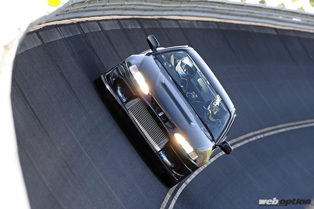 お馴染みの高速周回路で行われているチューニングカーの全開性能測定テスト。1周5.5km、半径約400mのコーナーと、45度バンクを備えたオーバル形状のテストコースで、クラブRH9各社が手がけたユーザーチューンドのポテンシャルを徹底検証!