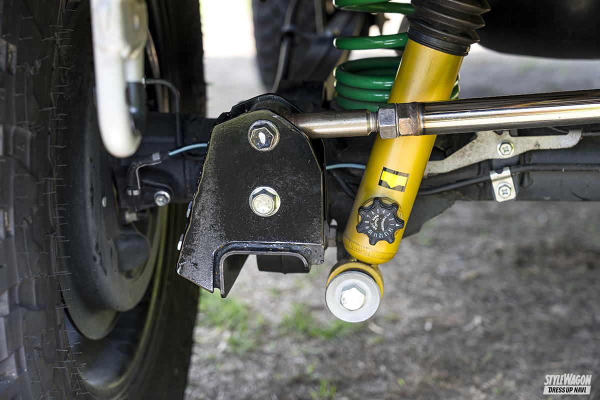 スプリング、減衰力14段調整式ショック、キャスタードリーム(偏芯ブッシュ)、ラテラルロッドなど全8アイテムがセットになった3インチアップキットの特徴はショック&スプリング共にロング仕様で、いわゆる「よく動く足」となっているところ。オフロードからロックまで対応可能だ。