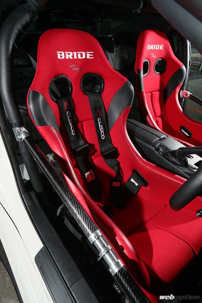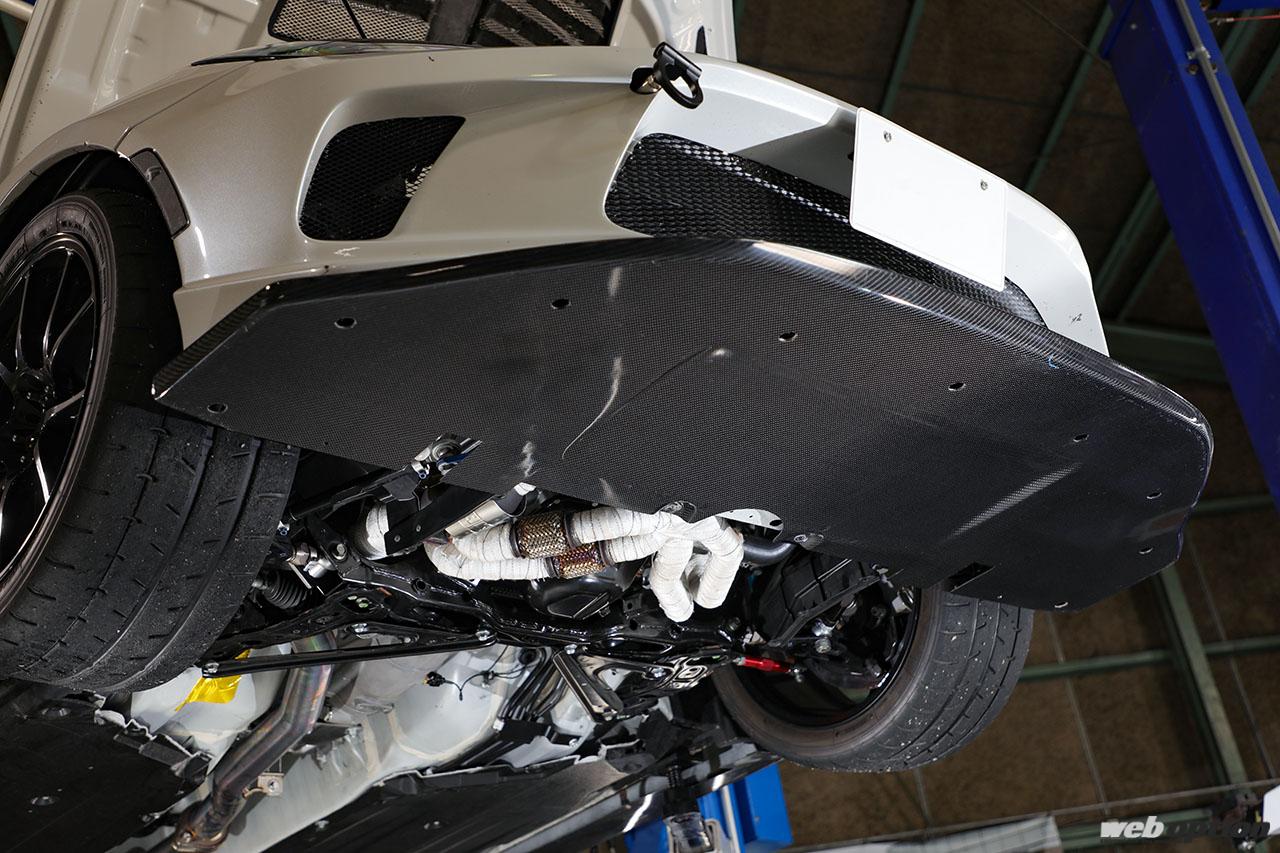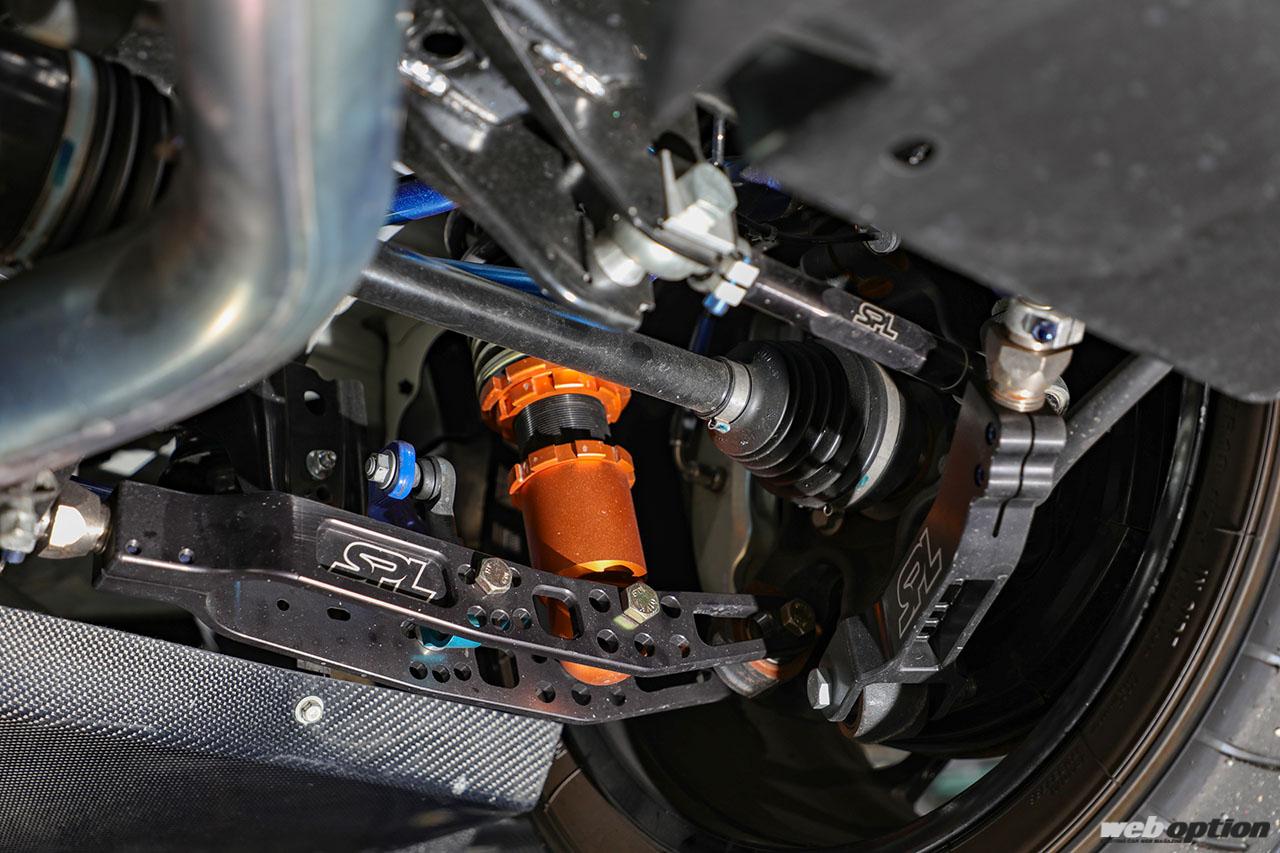 足回りは、オリジナル車高調(F12kg/mm R14kg/mm)や販売代理店を務めるSPLの調整式アームをフル投入して旋回性能やトラクション性能を高める。さらに、パワーオーバーになる部分は空力で補っていこうとセットアップを模索中だ。