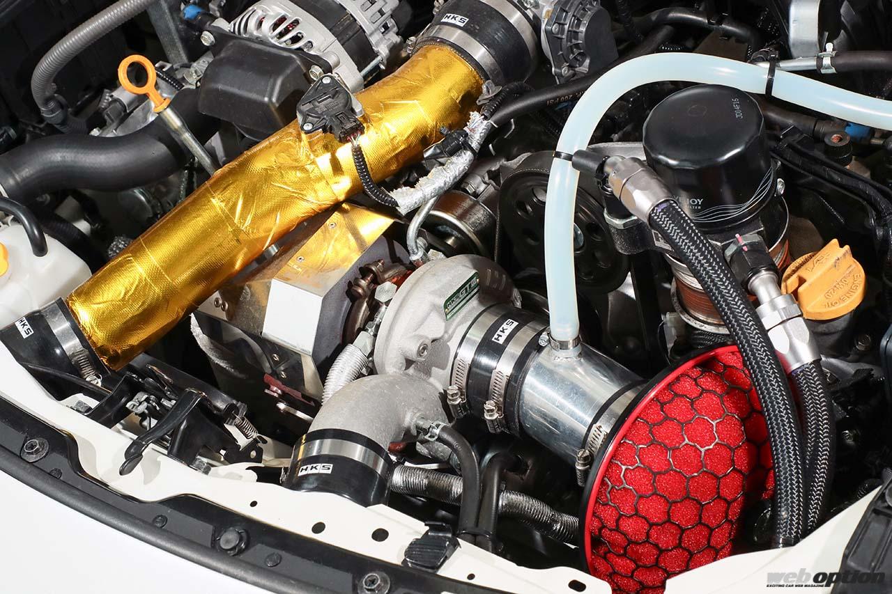 心臓部は、HKSのGTIII-RSタービンキットをセットしてブースト圧0.9キロ時に430psを発揮させるボルトオンターボ仕様だ。現状、エンジン腰下はノーマルだが将来的にはローコンプ仕様の2.5L化も見据えているという。