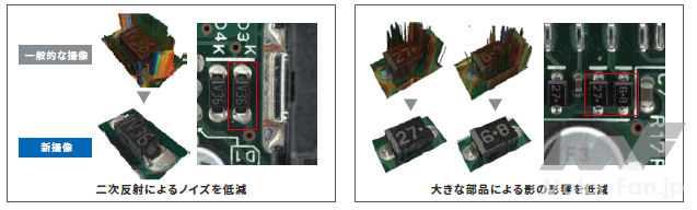 オムロン独自のMDMC照明を活用し、高度化する基板や部品の高精度検査を実現する撮像技術を開発した。照射角度、色、光量を自在に制御することで、従来の撮像方式に比べ、はんだの形状がより正確に捉えられることに加え、隣接する背高部品の影の影響排除や基板上のパターンや部品面上の印字を正確に捉えることが可能となった。