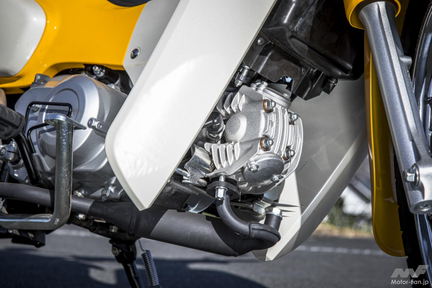 シリンダーヘッドに注目するとC125と同じに見えるが、クランクケース周辺にメッキの化粧部品は無い。エキゾーストパイプはブラックアウトされている。