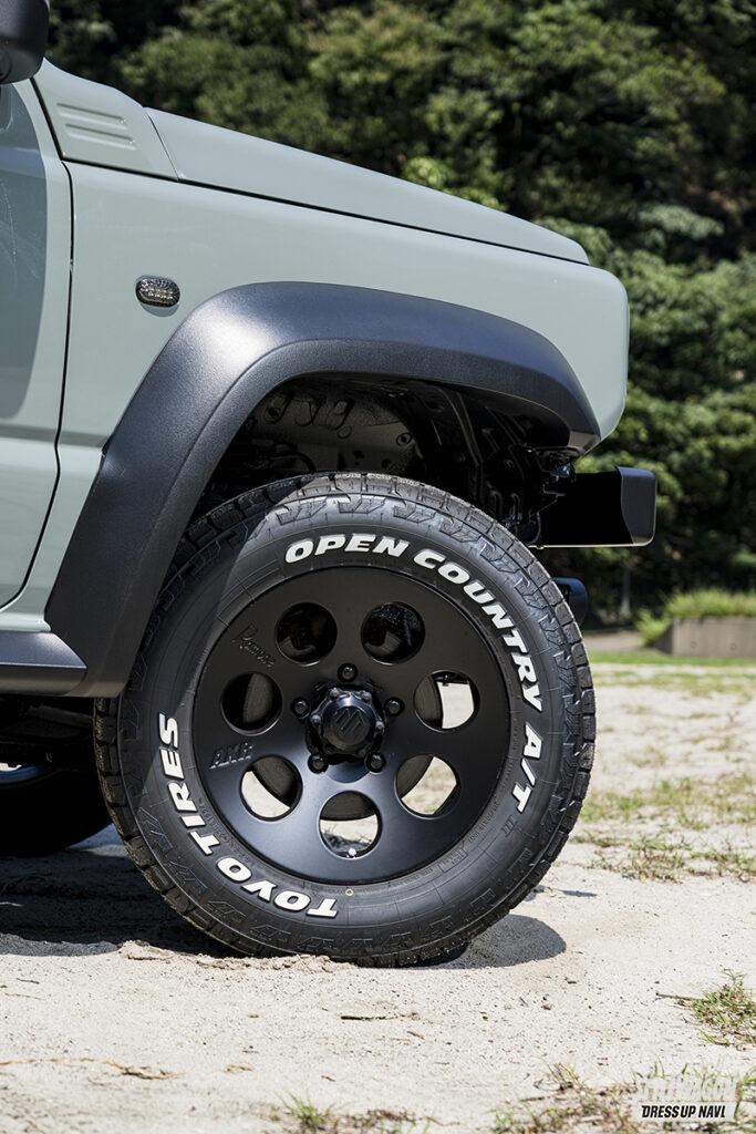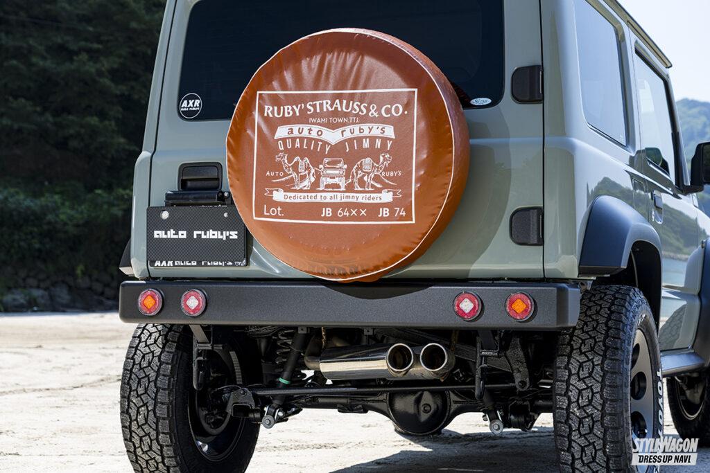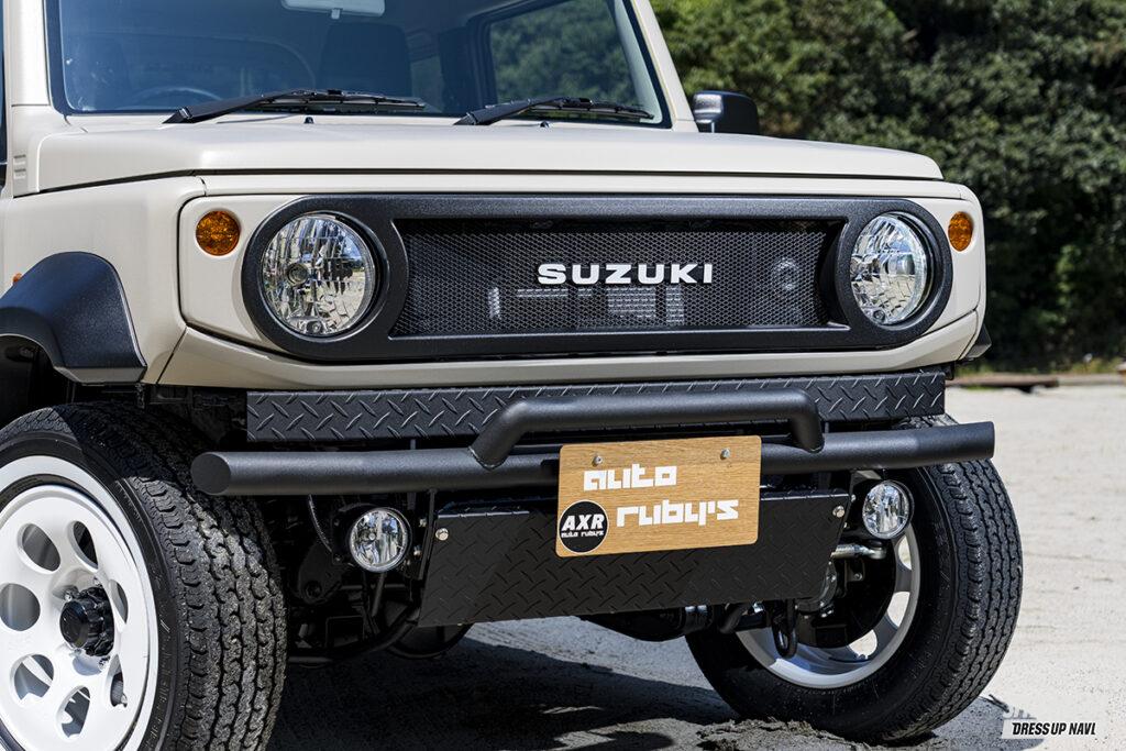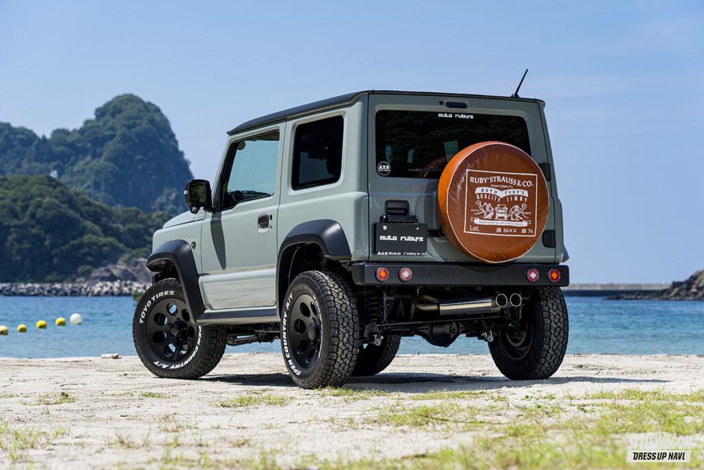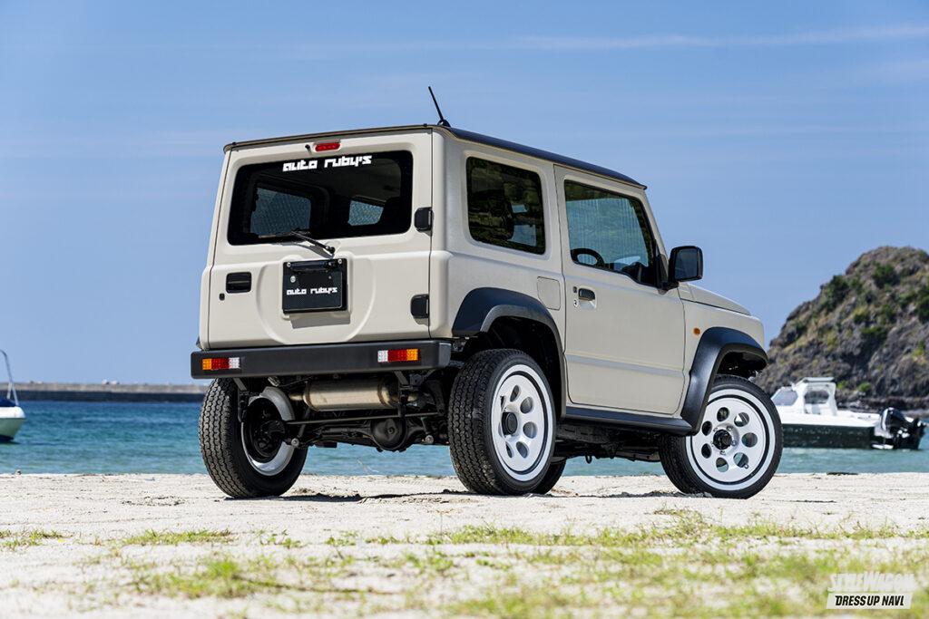今回はアースカラーがテーマ。アイボリーのJB74は純正のシフォンアイボリーではなく、スズキ・ラパンのシフォンベージュ+ルーフにウッディブラウンを加えたツートーン仕様。これにフロントに小ぶりなしし狩りデザインのヴィシャスバンパーを、リアはオールドスクールリアバンパーに角型テールを組み合わせている。いずれも新作で、やり過ぎないオフ感とキュートなイメージを見事に融和。お洒落な1台に仕上がった。