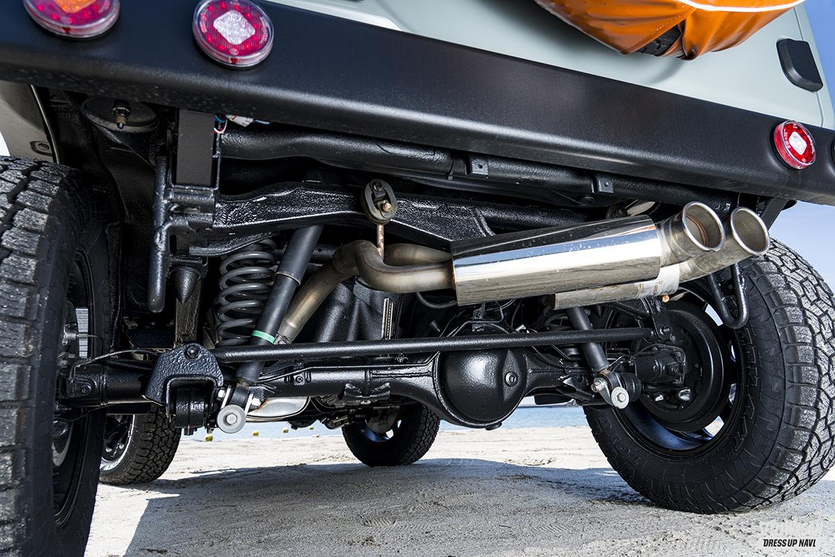 前後バンパーは鉄板のオールドスクールバンパーをセット。黒に塗装することで全体の印象を引き締めるなど、カラーコントラストも秀逸だ。