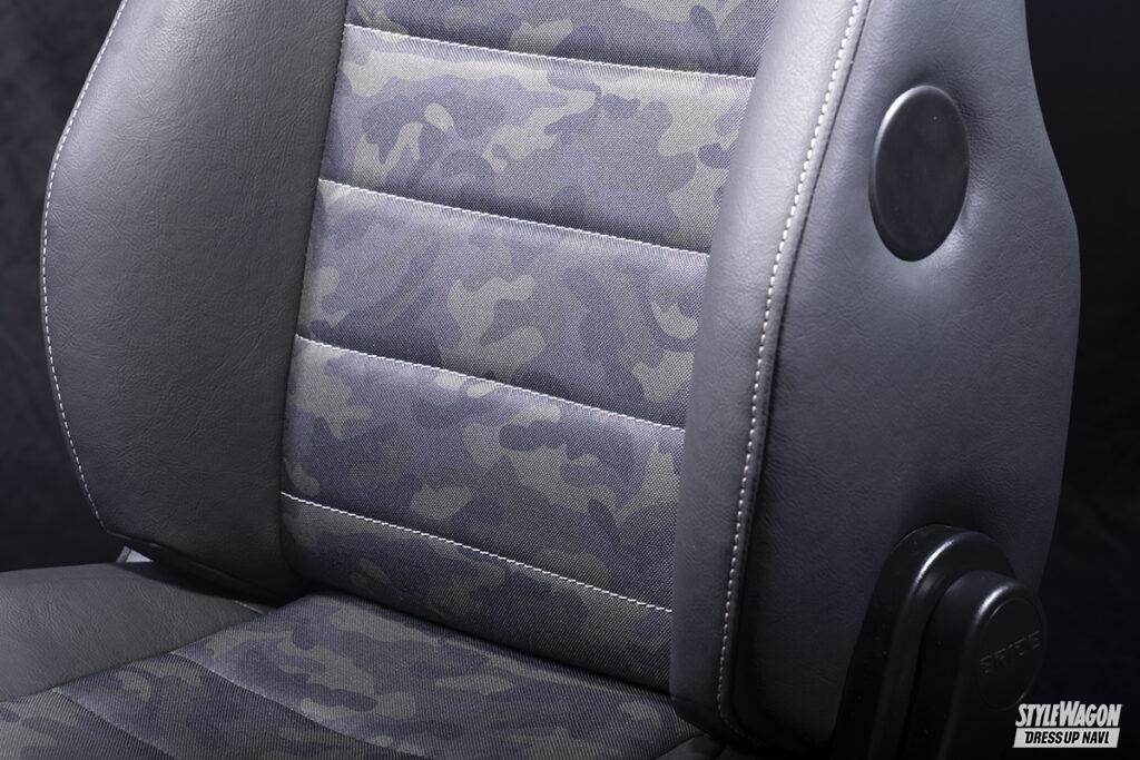 視線をシートに向ければ、以前だとオフロードでカラダをしっかりとホールドできるフルバケットの選択が多かったのだが、現行モデルでは快適で疲れにくいリクライニング機能の備わったセミバケが主流。女性オーナーの増加も手伝って、シートの色も黒一辺倒から、迷彩カラーなどこれまでには無かったカラーリングが増え、インテリアカスタムにおける重要アイテムとしてシート交換も注目されている。
