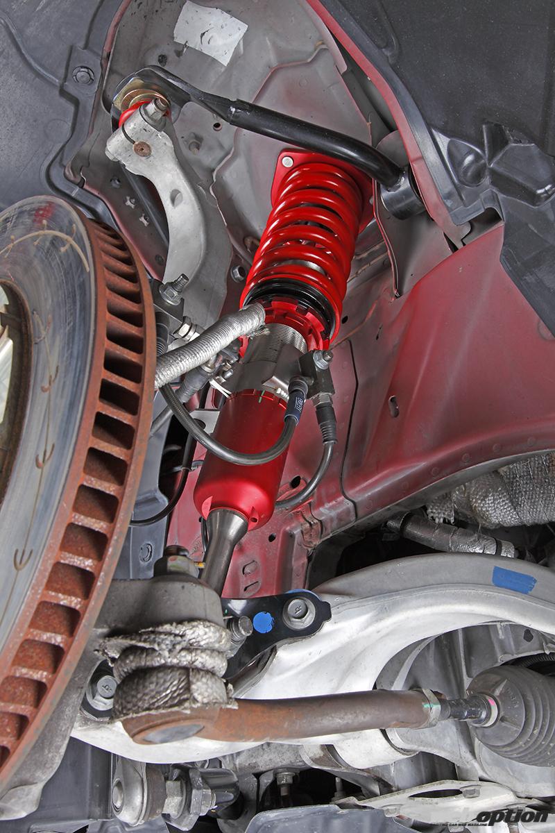 次に足回り。サスペンションにはMCRが長い時間をかけて開発したオリジナル車高調を装備する。異音の発生を嫌いアッパーマウントを強化ブッシュとし、バネレートはスポーツ走行を視野に入れフロント14kg/mm、リヤ12kg/mm(標準F14kg/mm R12kg/mm)をセット。アーム関連はフロントに調整式アッパーアームを、リヤにキャンバーアームを導入している程度だ。