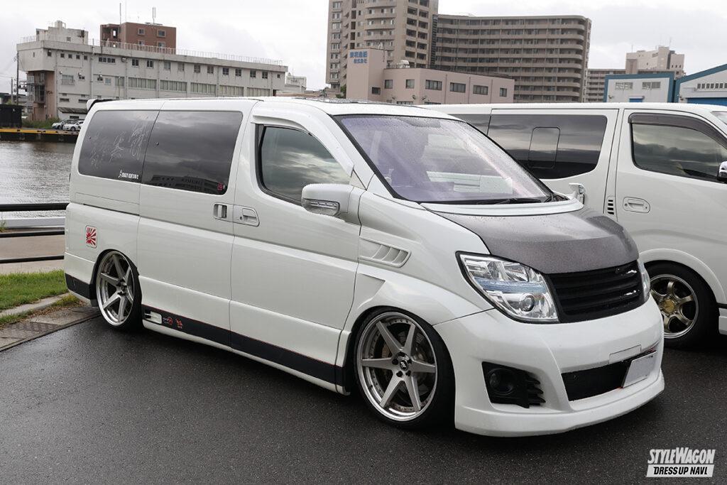 それまでは3年くらいでクルマを替えていたのに、E51エルグランドに出会ってからは、17年目とすご〜く長く乗り続けている! 「足まわりはほぼ関西で作ってもらっている」そうで、リアのスプリングを直巻き化しているのが特長。しかも、こだわりのチューニング派に重用されるハイパコ製。ボンネットはカーボン製だが、ラメ塗装したため、カーボン感ゼロな点が面白い!!