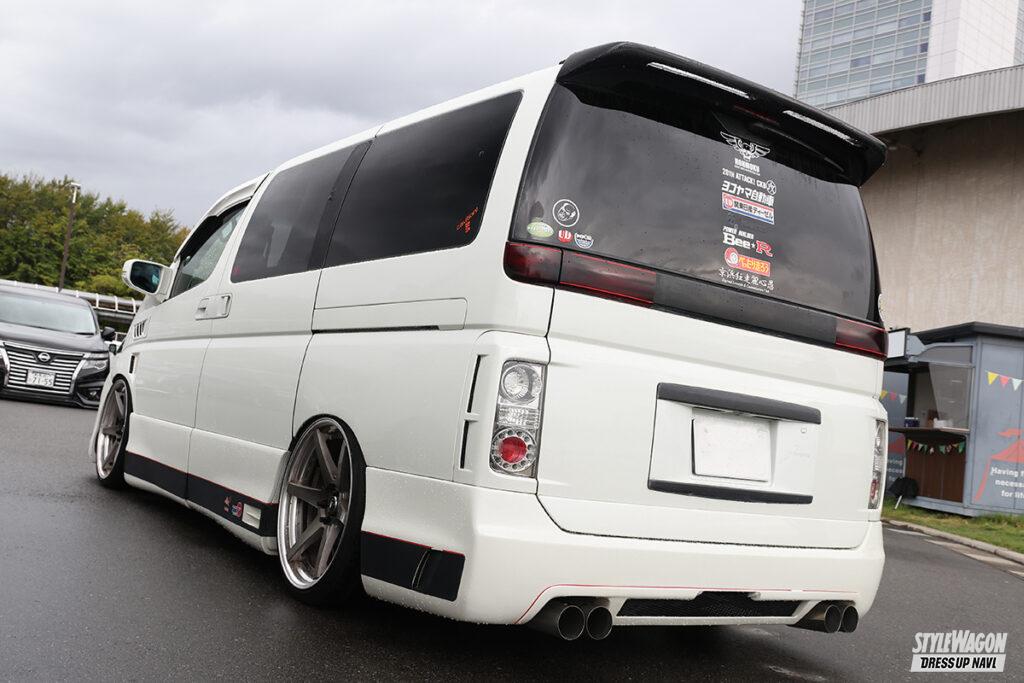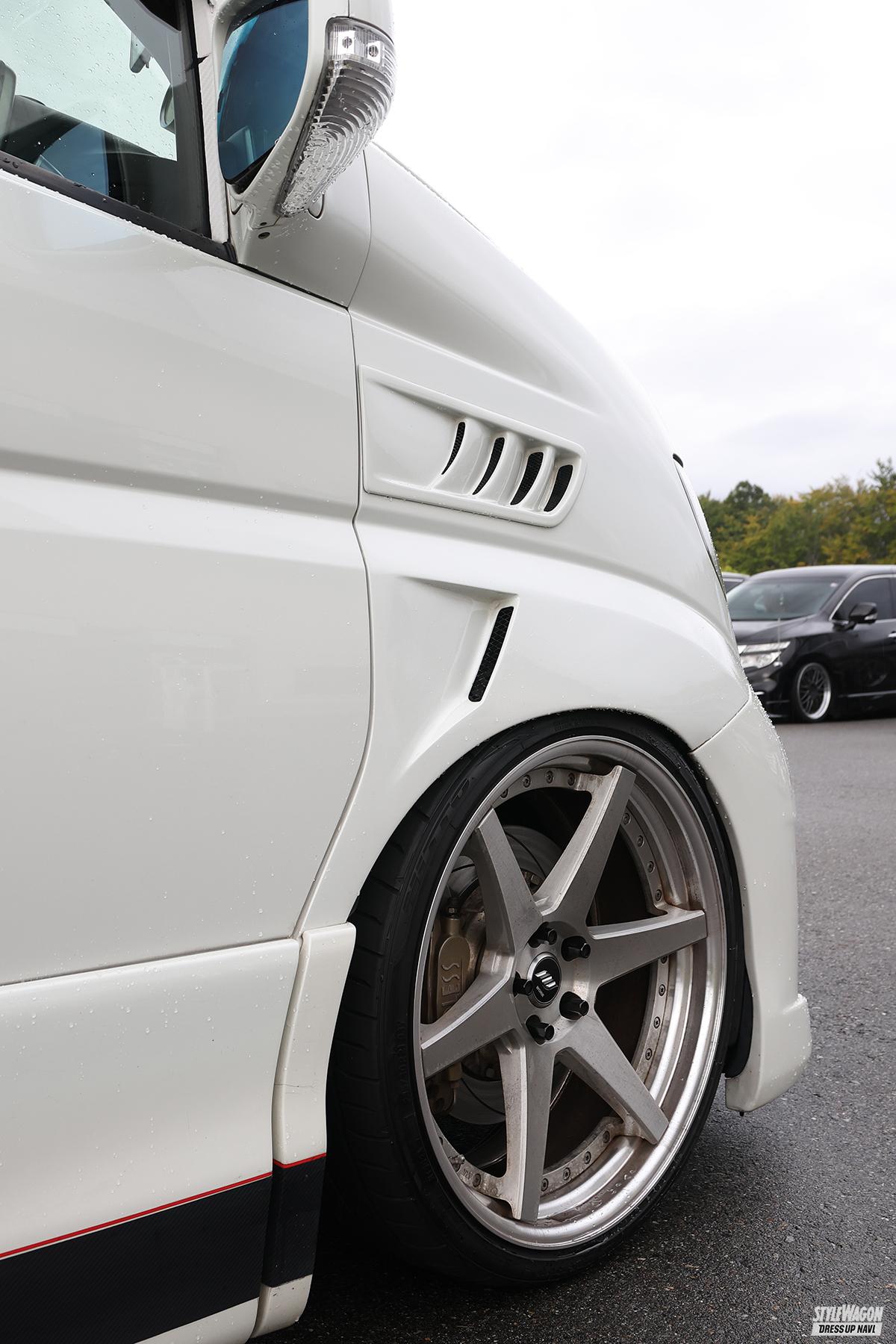 それまでは3年くらいでクルマを替えていたのに、E51エルグランドに出会ってからは、17年目とすご〜く長く乗り続けている! 「足まわりはほぼ関西で作ってもらっている」そうで、リアのスプリングを直巻き化しているのが特長。しかも、こだわりのチューニング派に重用されるハイパコ製。ボンネットはカーボン製だが、ラメ塗装したため、カーボン感ゼロな点が面白い!!