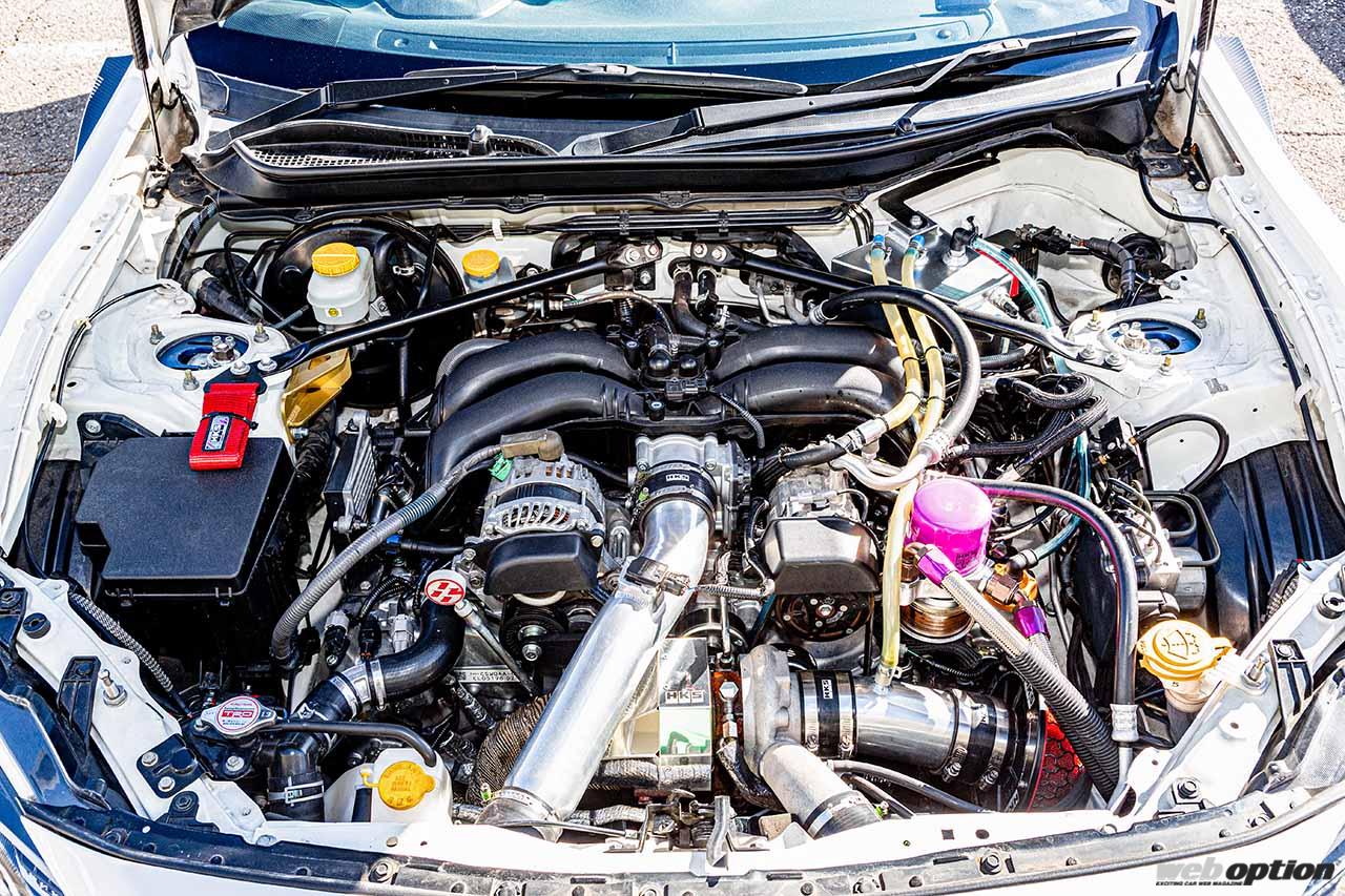 大幅なパフォーマンスアップを一気に図りたい境さんにとって、これはまさに“渡りに船”と言える話。「どうせエンジンを載せ換えるなら排気量アップまでやって…」と考えるのは当然で、デモカーのエンジンルームにはHKS製キットを組んだFA24改2.5L仕様が収まることとなった。エンジン換装にあたってメカニカルな部分は一部に細かい加工が必要だが、基本はほぼボルトオンで搭載可能。