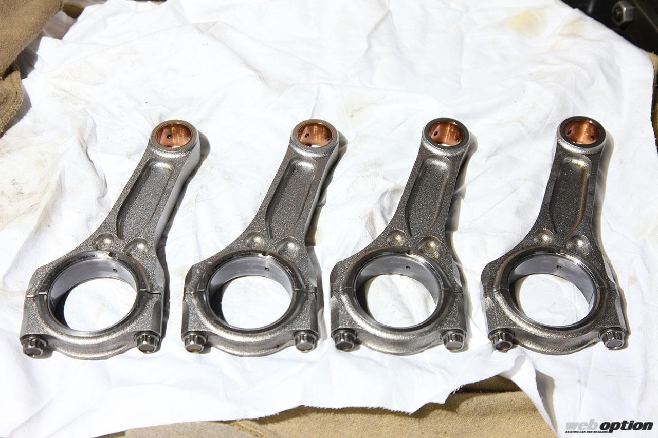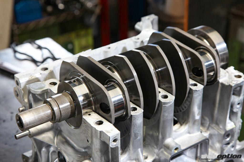 ノーマル比4mmアップとなる90.0mmストロークのHKS製鍛造クランクシャフト。カウンターウエイトはバランスを考慮した無駄のない形状で、ピンジャーナル径は専用サイズに設定される。これで排気量は2387ccから2498ccへと拡大。