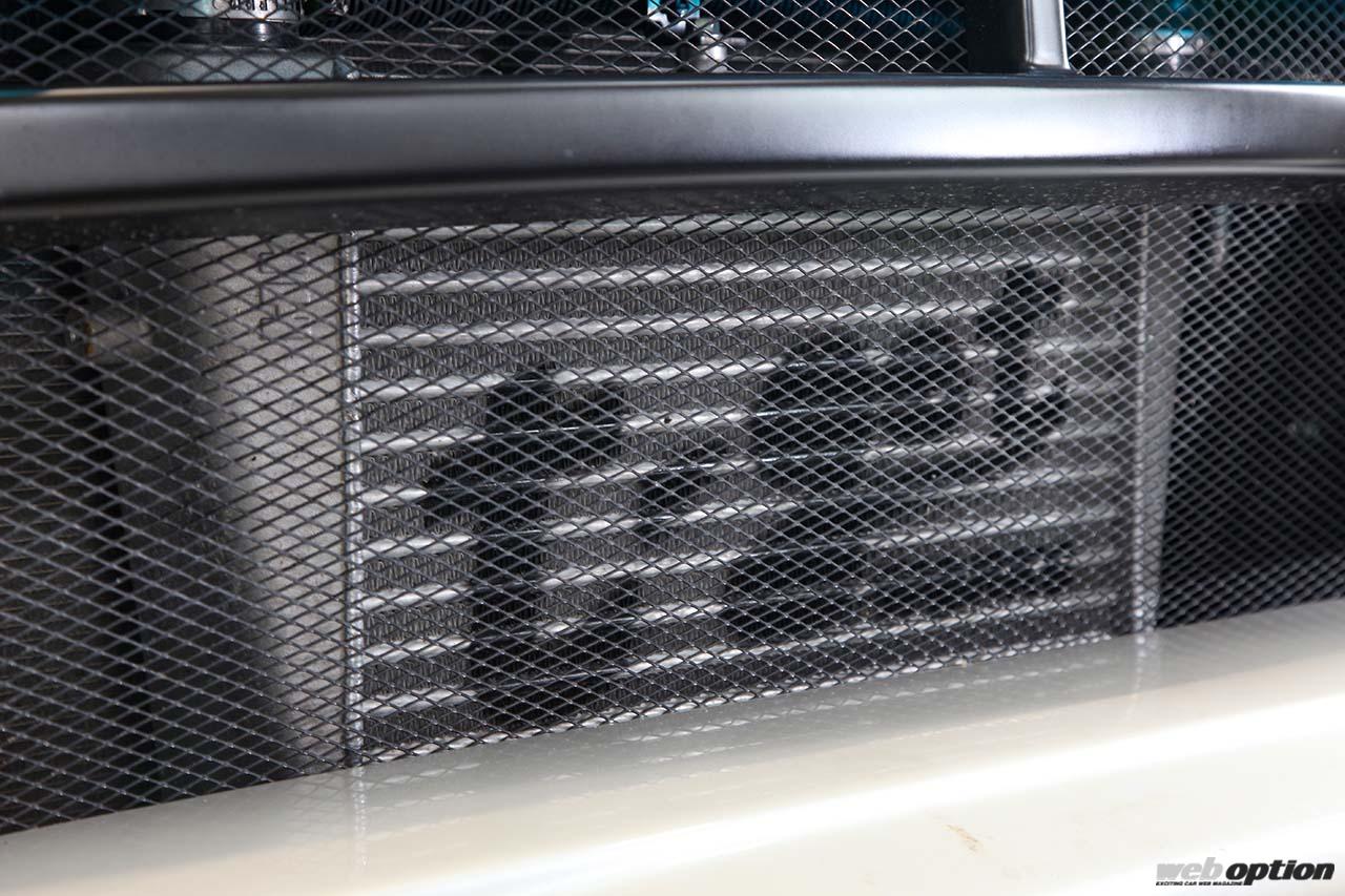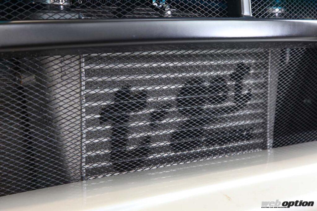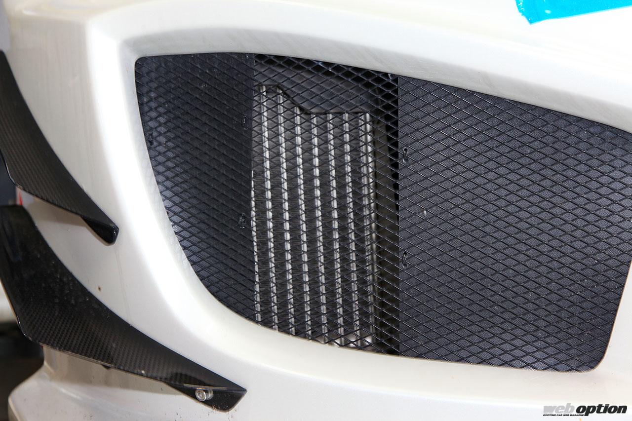 前置きインタークーラーはHKSターボキットの付属品。バンパー右側開口部の奥にはHKS製オイルクーラーも追加される。境さんいわく、「エンジンオイルクーラーはオイルパンバッフルプレートと併せて装着必須。サーキットを走るなら、ノーマル(NA)でも必要なパーツです」。