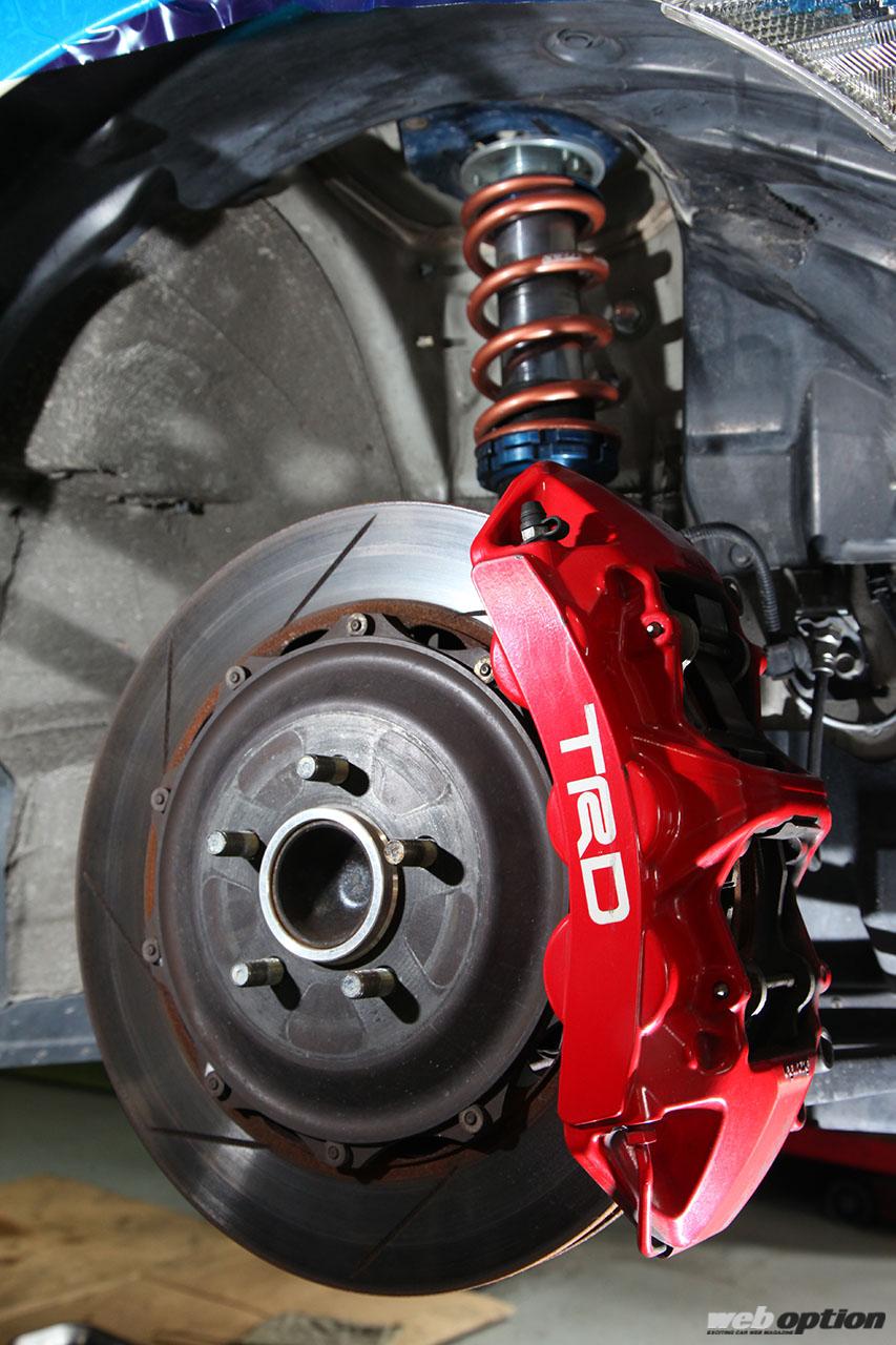 車高調はDG-5ベースで、ウィステリアと共同開発したt-getオリジナル。スプリングレートはフロント8kg/mm、リヤ10kg/mmで独自の減衰力セッティングが施される。ブレーキはTRD製モノブロックキットで強化。キャリパー&ローターはフロント6ポット+355mm、リヤ4ポット+345mmが組み合わされる。