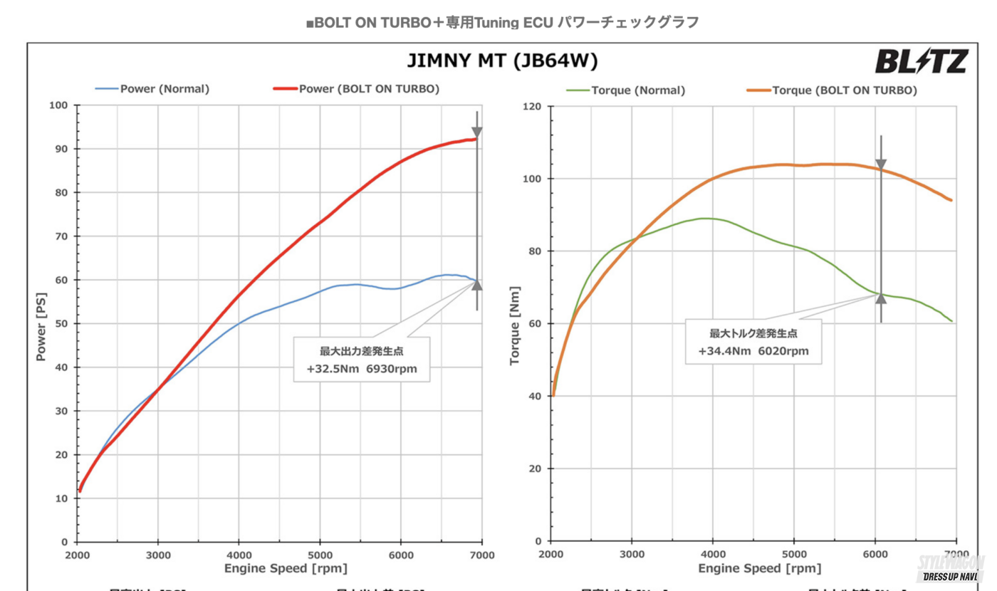 純正でターボ車とはいえ、「JB64は、やっぱり走りが物足りない」と感じたらおすすめは“ボルトオンターボシステム”。内蔵されたタービンブレードを大型化したハイフローターボと呼ばれるモデルで、純正と交換するだけでも出力・馬力のアップが見込める。純正コンピューターのままでも取り付けできるというのが優れた点だが、より効果を高めたいならば、ブリッツのチューニングECUとの組み合わせがおすすめ。もはや純正とは別物の走りへと生まれ変わるはずだ。
