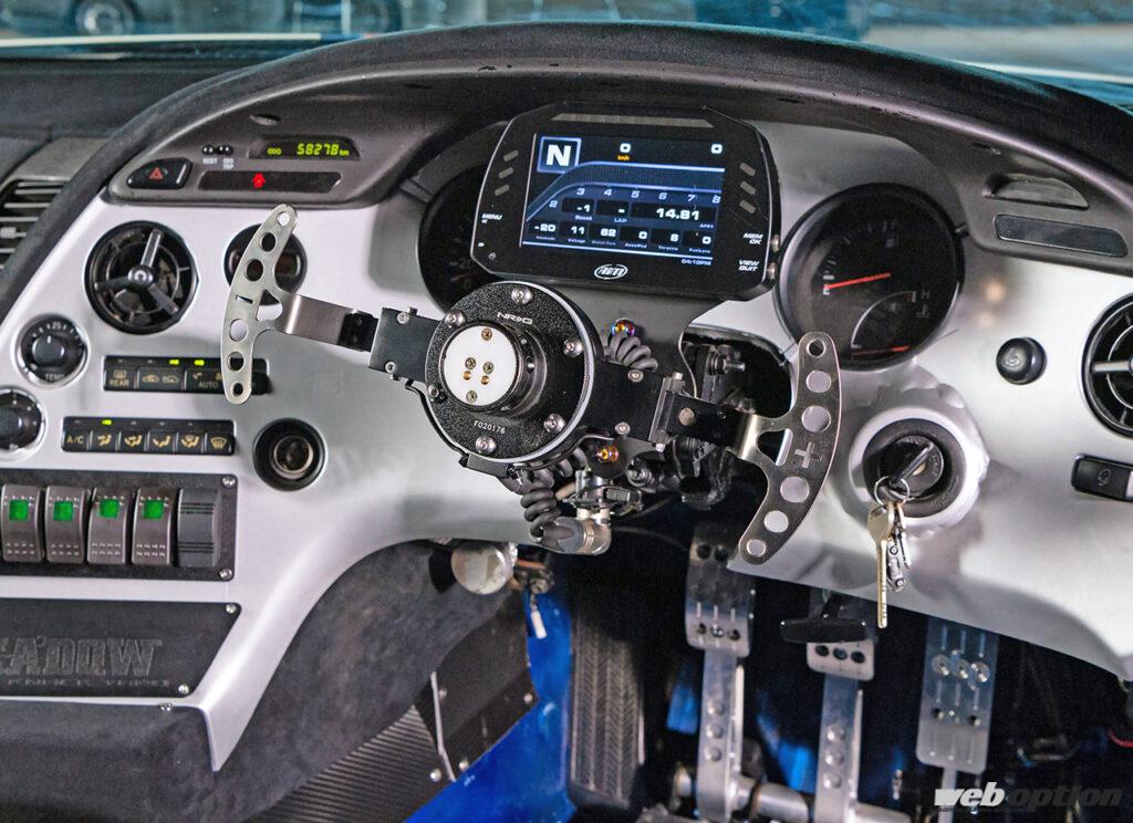 コクピットメイクも凄まじい。ミッションはアルビンス製のST6(6速シーケンシャルドグ)を搭載しているが、シフトはIパターンからアクチュエーター制御のパドルシフトに変更。これはオーナーによる完全なオリジナルシステムとのことで、電子制御スロットルを含めた綿密なマネージメントによって電光石火のシフトチェンジを可能としている。