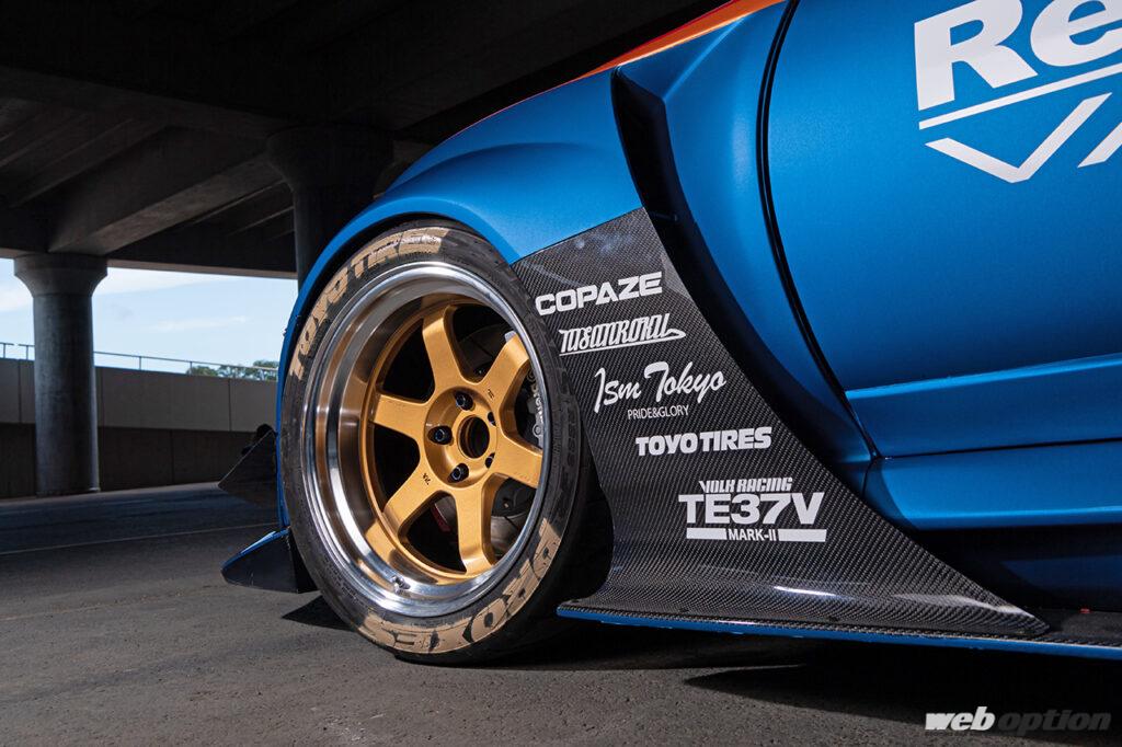 超深リムのホイールは、18インチのボルクレーシングTE37VマークII。サイズはフロント10.5Jマイナス20、リヤ11Jマイナス30の設定で、ディスクカラーはゴールドにカッパーを混ぜたオリジナル調合だ。パツパツにセットされたプロクセスR888R(F275/35-18 R315/30-18)がトラックスタンス仕様を物語る。
