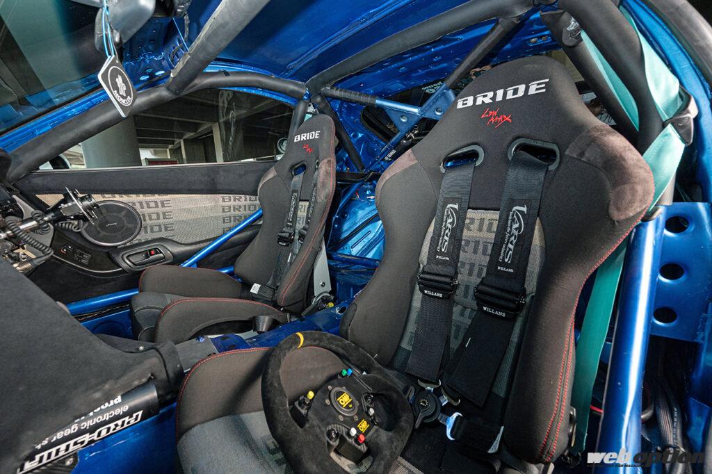 シートはブリッドのガイアスIIで、レーシングハーネスにはレアなウィランズとバリスのコラボモデルを装着。内装パーツの各部を、アルカンターラ&ブリッドグラデーションファブリックで張り替えている点も見逃せない。