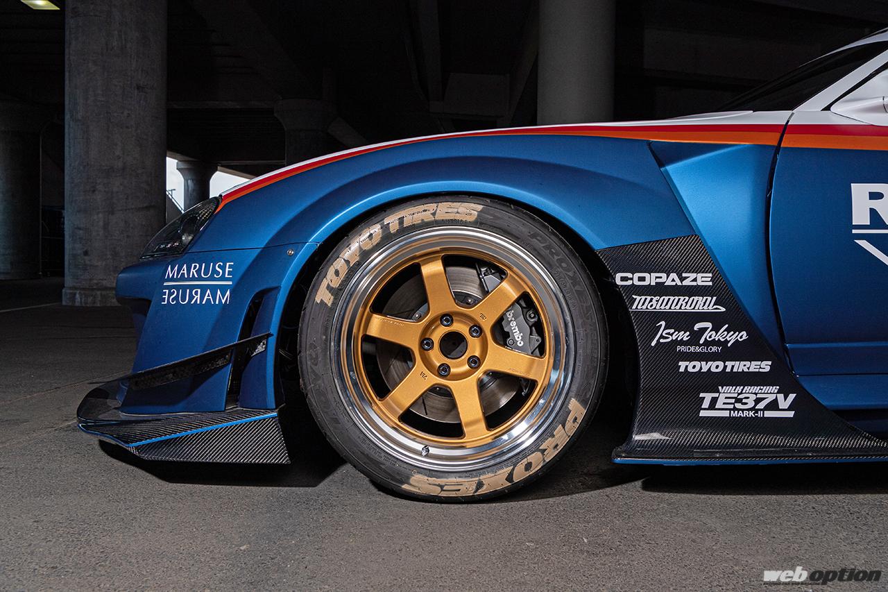 超深リムのホイールは、18インチのボルクレーシングTE37VマークII。サイズはフロント10.5Jマイナス20、リヤ11Jマイナス30の設定で、ディスクカラーはゴールドにカッパーを混ぜたオリジナル調合だ。パツパツにセットされたプロクセスR888R(F275/35-18 R315/30-18)がトラックスタンス仕様を物語る。