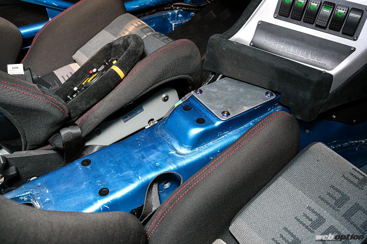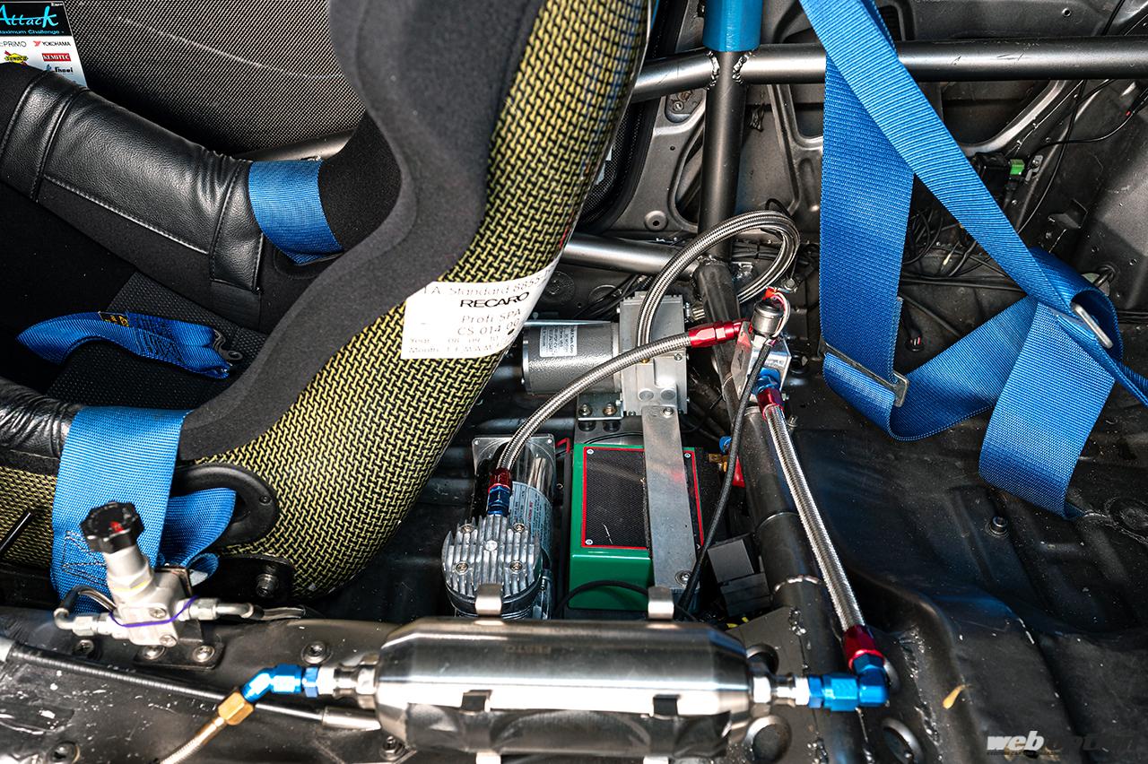 コクピットメイクも凄まじい。ミッションはアルビンス製のST6(6速シーケンシャルドグ)を搭載しているが、シフトはIパターンからアクチュエーター制御のパドルシフトに変更。これはオーナーによる完全なオリジナルシステムとのことで、電子制御スロットルを含めた綿密なマネージメントによって電光石火のシフトチェンジを可能としている。