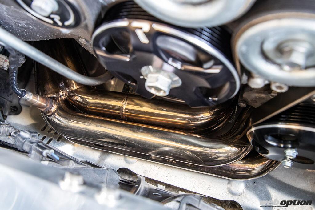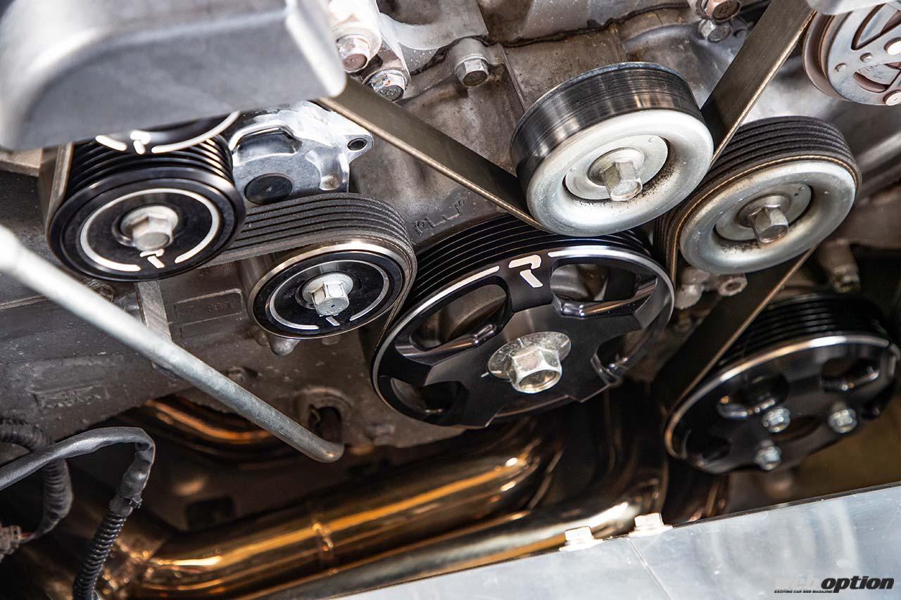 Raceseng(レースセング)の軽量クランクプーリーを装着。その他、各種リザーバー類のキャップにVERUSエンジニアリングのアルミビレット製を使用することで、エンジンルーム全体の色味をモノトーンで統一させている。