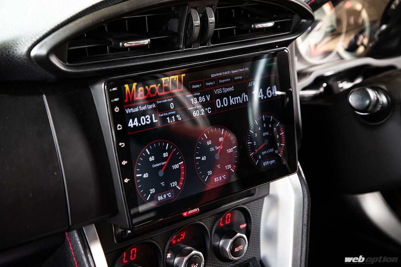 マキシスECUは複数種類のECUをラインナップするが、吸排気の両側にVVTを搭載するFA20の制御には今回の『RACE』など、上位クラスのモデルが必要とのこと。RACEは8気筒分のシーケンシャル噴射&独立点火に対応し、ワイドバンド空燃比コントローラーを標準で内蔵。デュアル電動スロットルやフレックス燃料にも対応するなど、カバーする領域の広いECUだ。