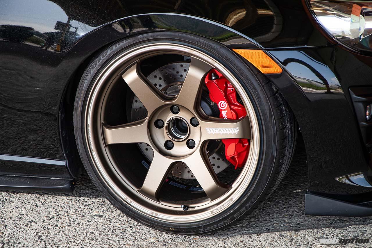 池田さんが所有していた時からP.C.D.を5H-100から5H-114.3にコンバート済み。冨田さんが選んだホイールはTE37ウルトラトラックエディションIIで、サイズは前後とも9.5J×19+22。タイヤはトーヨーのプロクセススポーツ2。ブレーキは86用のキャリパーブラケットを調達した上でブレンボを装着し、フロント6ポット、リヤ4ポットにドリルドローターを組み合わせる。