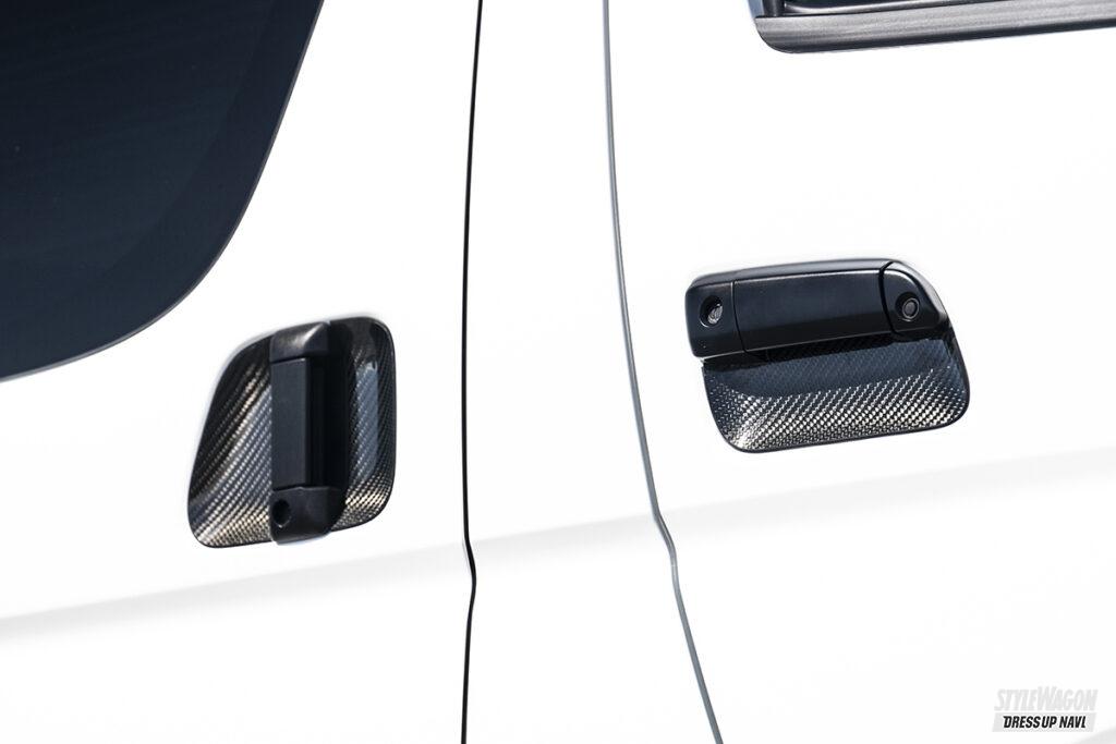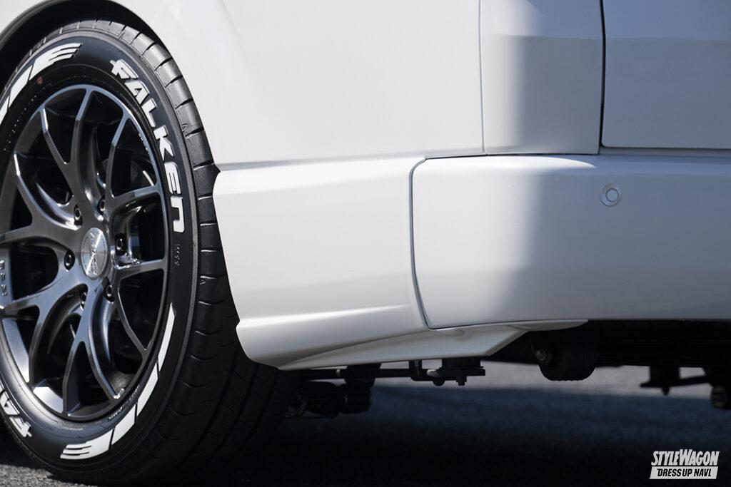 一方でここで紹介するホワイトボディのデモカーは、同じキットにオーバーフェンダーなしの3.5インチダウン。足もとにはSSL6ホイール&バンタイヤを組み合わせ、シンプルなスポーティバンスタイルを作り出している。このボディキットなら合わせるボディカラーやホイール&タイヤによって、オンでもオフでも好きなスタイルを作り出すことができる、というエムテクノからの新提案なのだ。