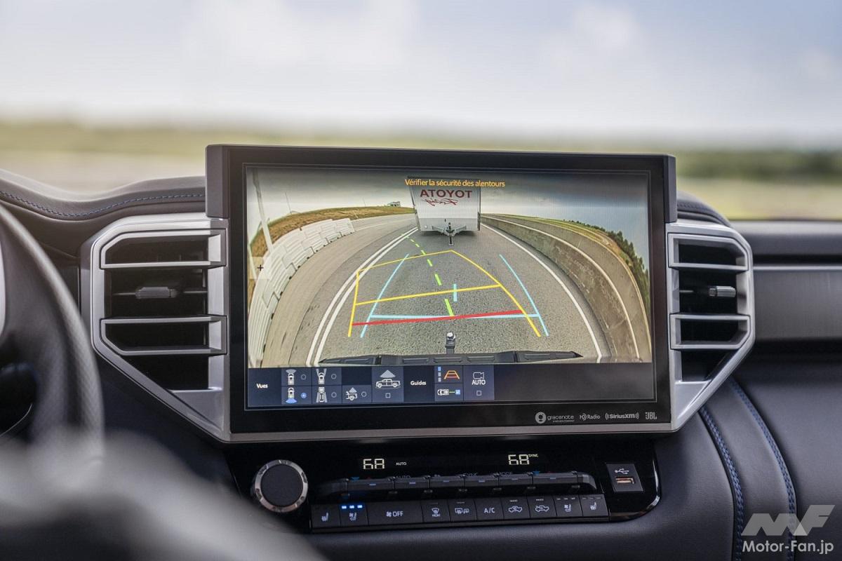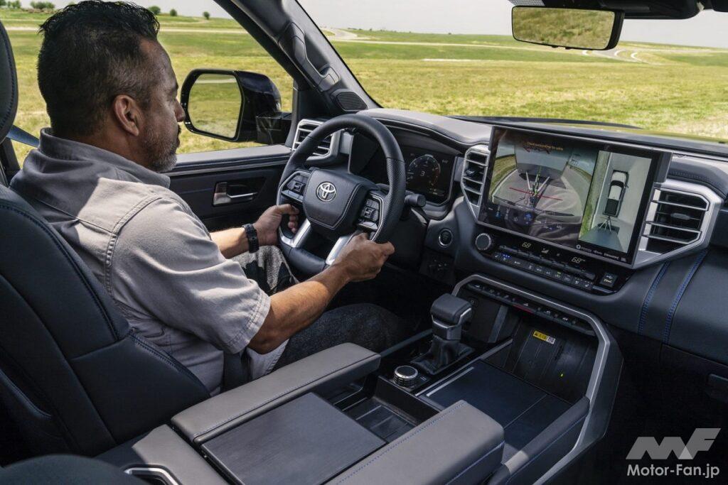 新型タンドラに搭載される、i-FORCEツインターボV6は、DOHC24バルブシリンダーヘッドとデュアルVVTiシステムにより、最高出力389ps、最大トルク649Nmを発揮。ハイエンドモデルには、最高出力437ps、最大トルク790Nmを発揮する、i-FORCE MAXハイブリッド・パワートレインが搭載されている。低速域では電気モーターが出力を発揮するが、時速28.8km以上になるとガソリンエンジンが常時作動し、中高速域で最適なパフォーマンスを発揮する。燃費については、市街地燃費:8.5km/L、高速燃費:10.2km/L、複合燃費:9.3km/Lとされている。